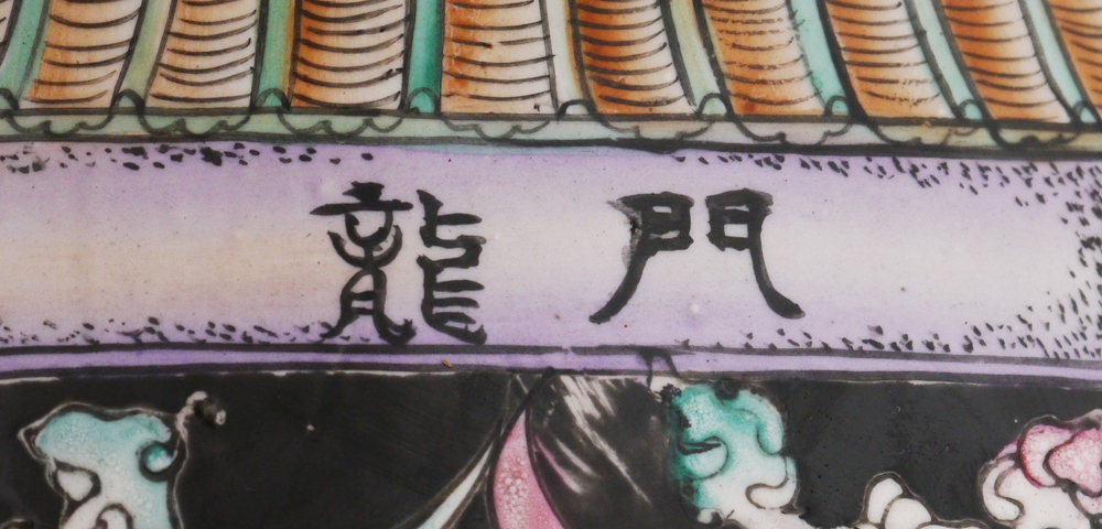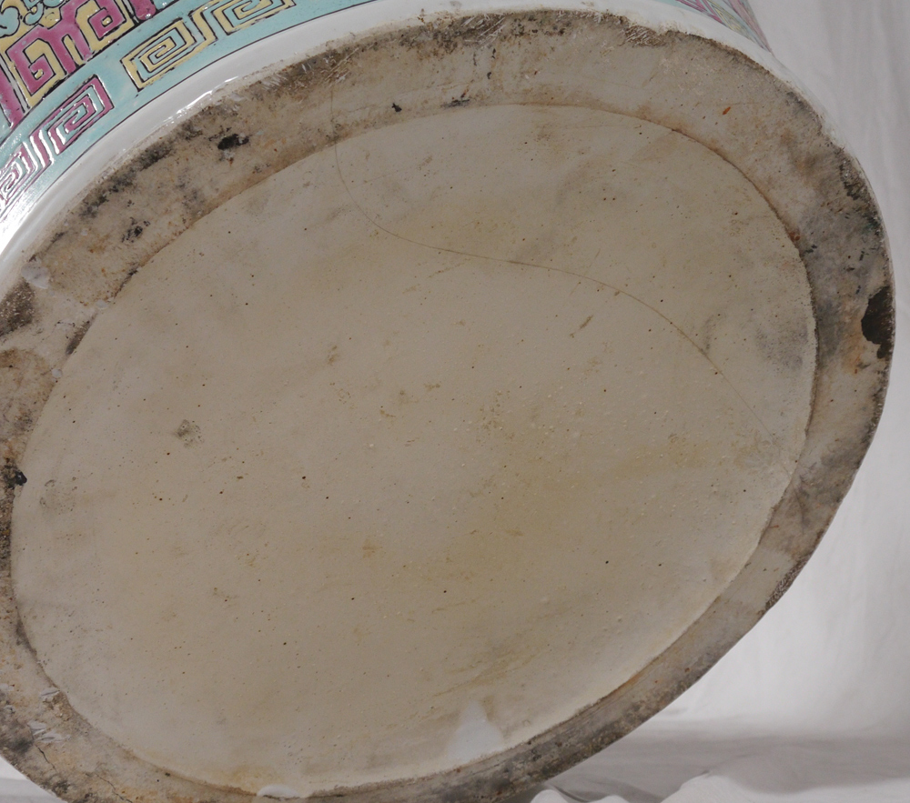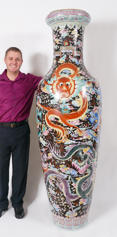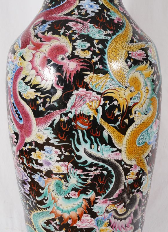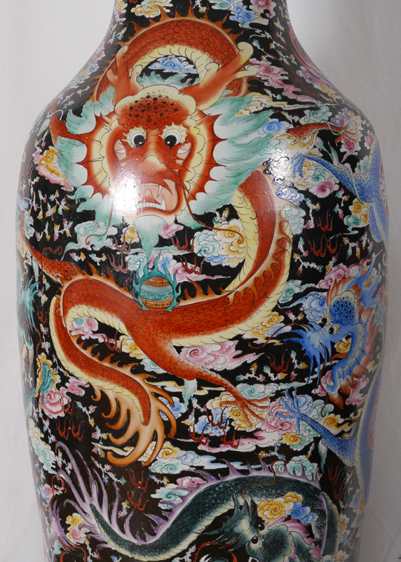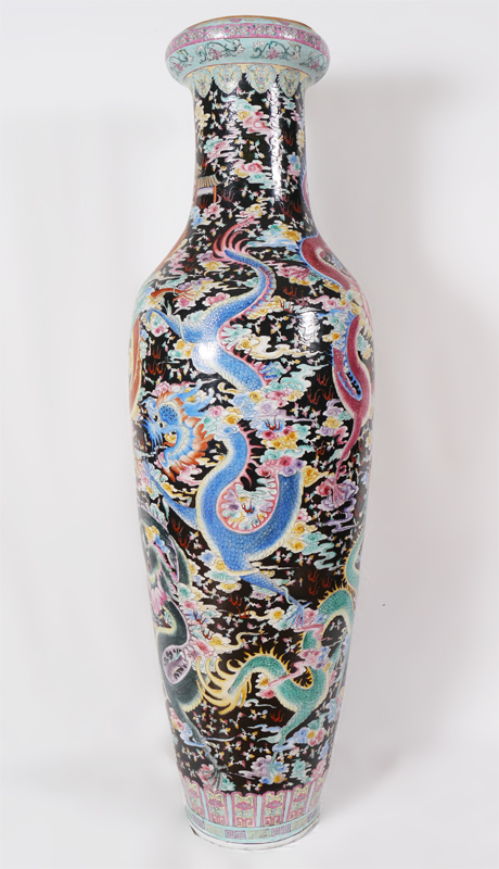 A MONUMENTAL 7 FT TALL ORIENTAL PALACE VASE: Incised polychrome dragons in clouds and temple decoration. 20th century, overall 84'' h. x 27'' dia.