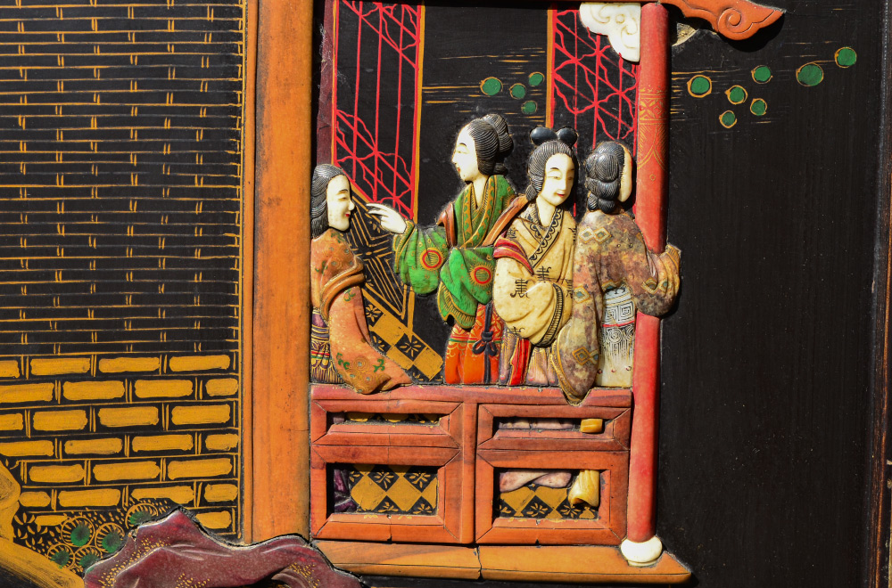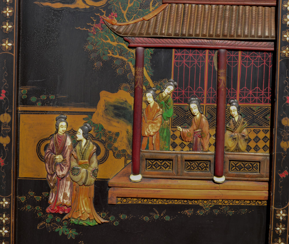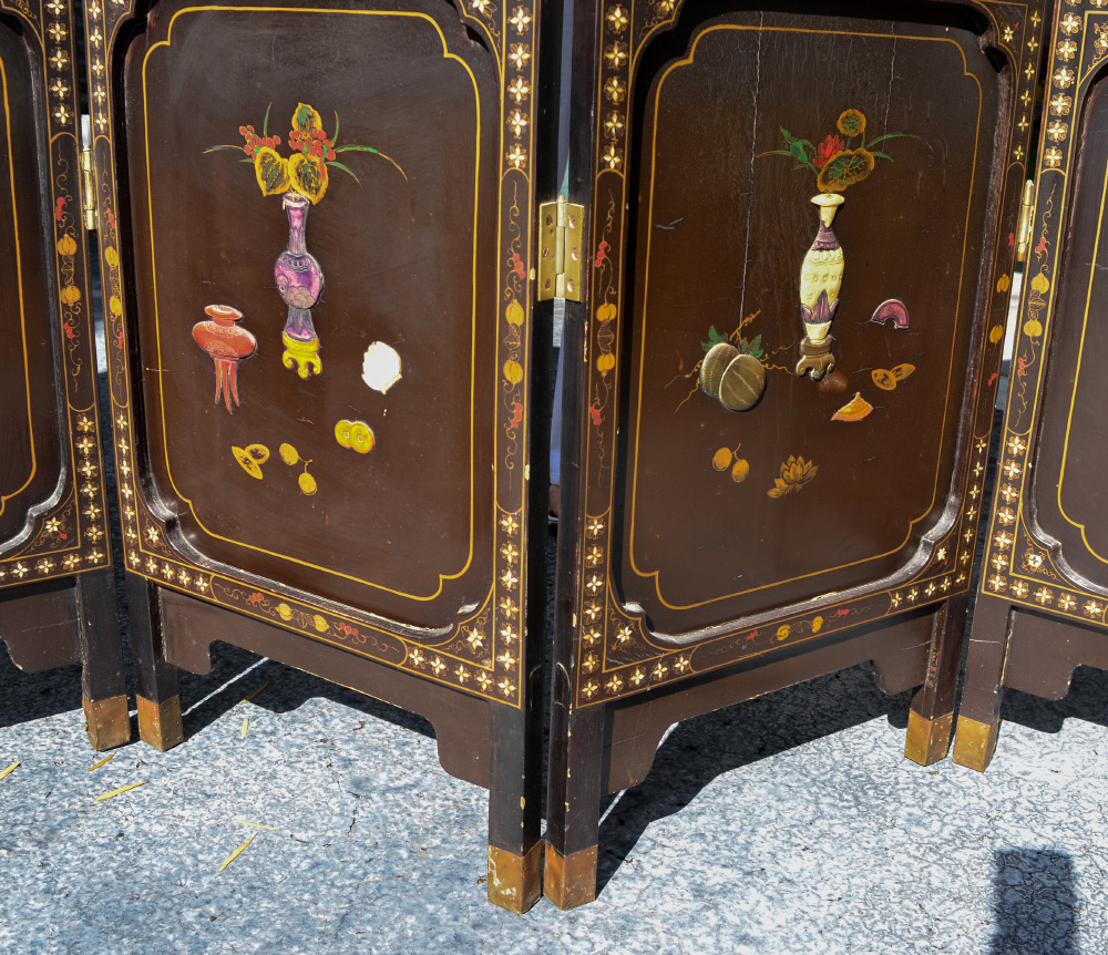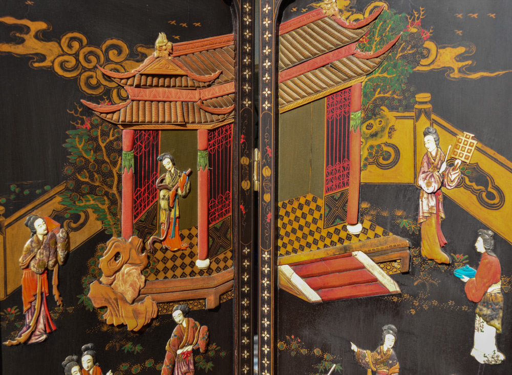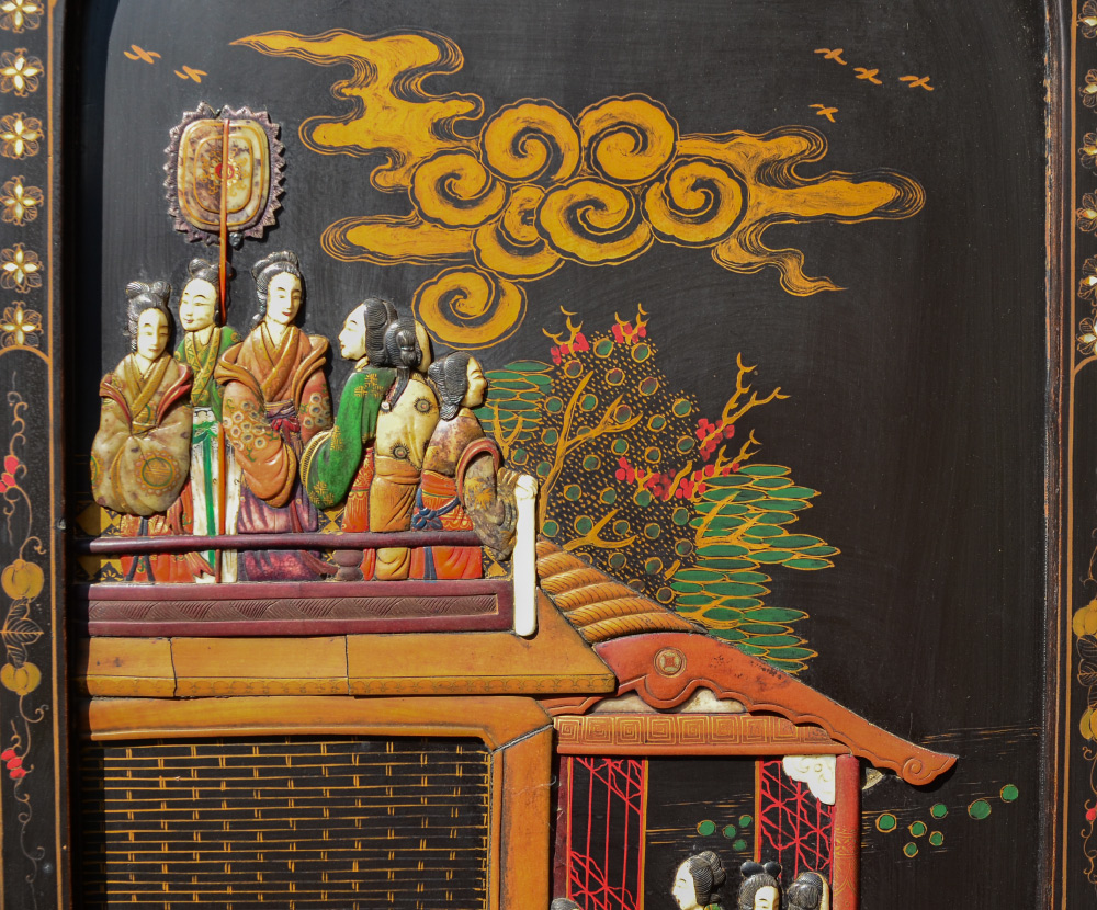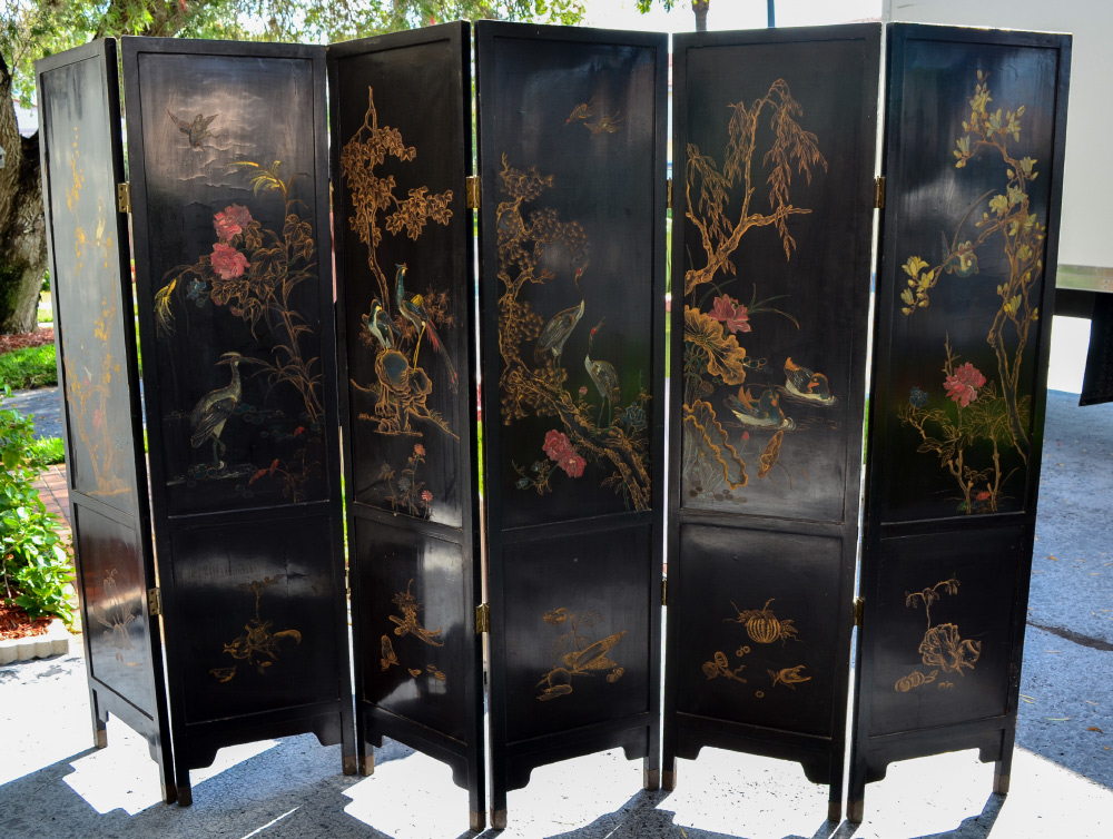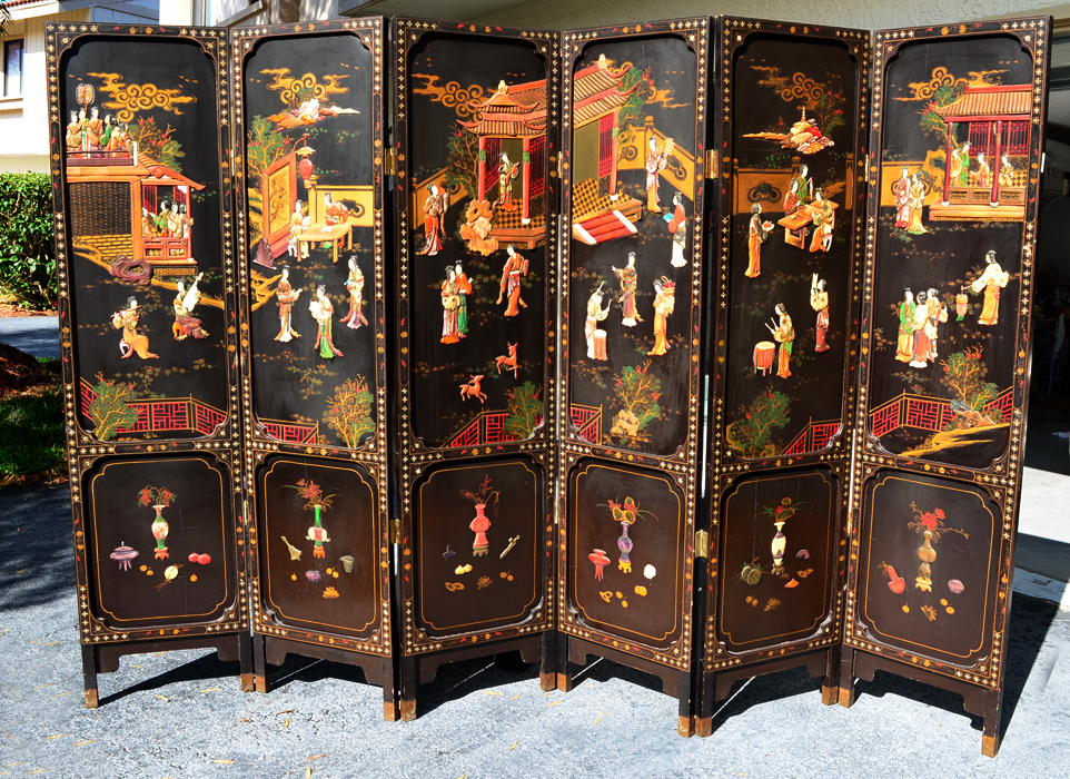 RICHLY ADORNED 6 PANEL CHINESE COROMANDEL SCREEN: This magnificent turn of the century black lacquer 6 panel coromandel screen is decorated with peaceful Oriental genre scenes depicting garden parties, musicians, animals, and floating clouds painted and inlaid with bone, soapstone, and other semi-precious stones. Note: The famous fashion designer Coco Chanel was an avid collector of Chinese folding screens, especially the Coromandel screens, and is believed to have owned 32 folding screens of which eight of them were housed in her apartment at 31 rue Cambon, Paris.
