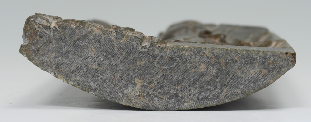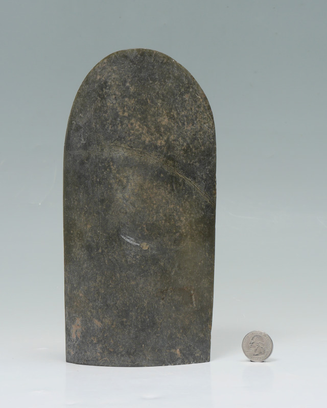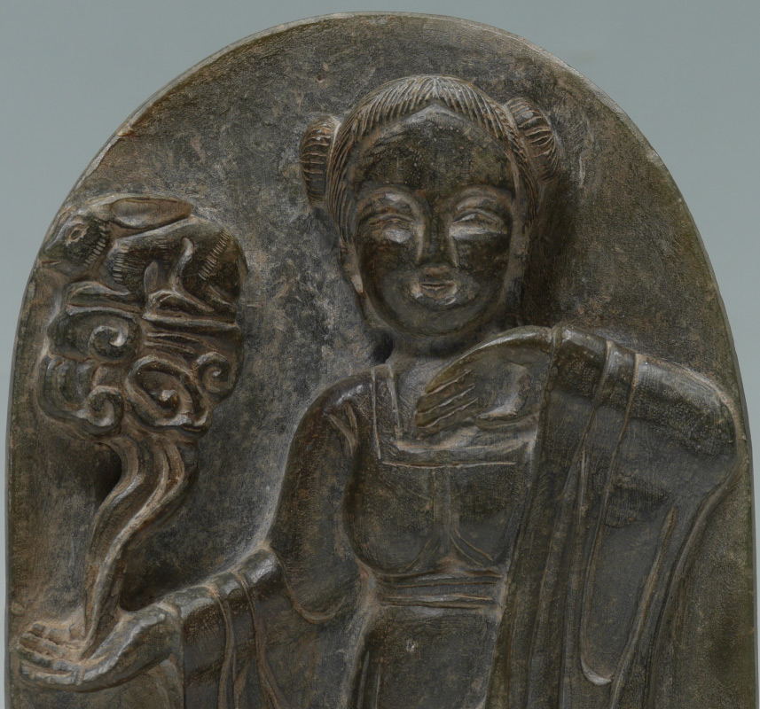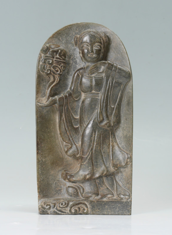 CHINESE CARVED SERPENTINE FIGURAL PLAQUE: Standing plaque with concave back, carved relief figure of a woman holding a rabbit perched on wisp of smoke in one hand. Overall measures 9 1/2'' x 4 3/4'' x 1 1/2''.