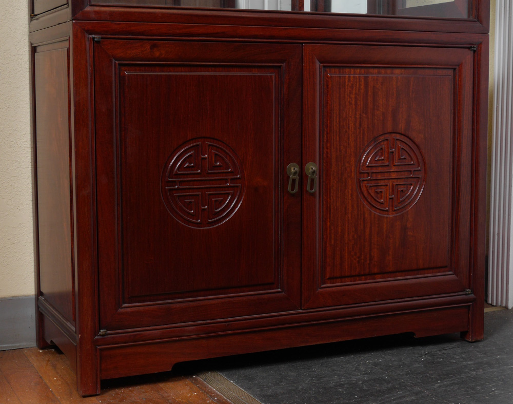 SIDE DOOR OPENING CHINESE STYLE CURIO DISPLAY CABINET: Glass front and sides, stepped shelf interior with mirror back, blind storage at the bottom. Measures approx. 72'' high x 32'' x 14''.