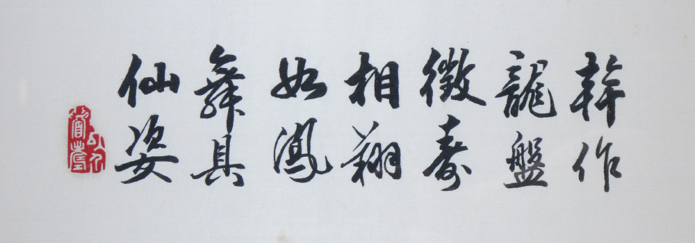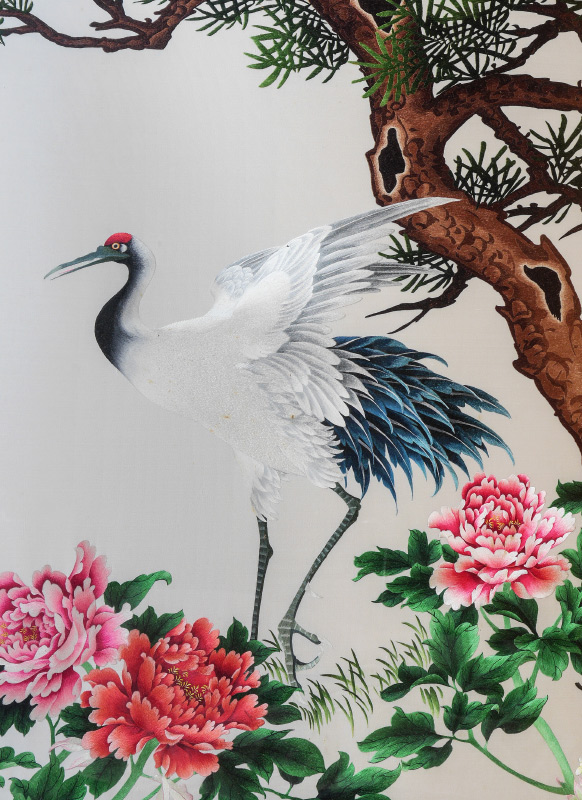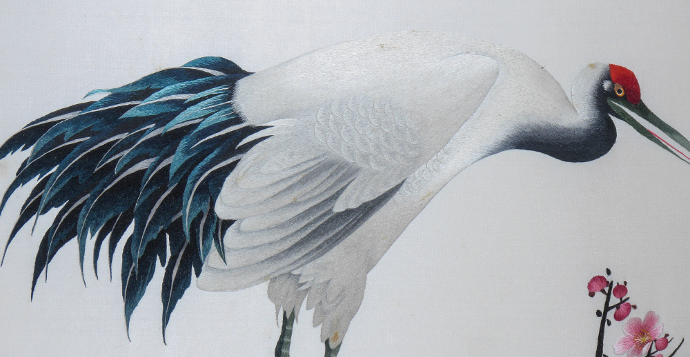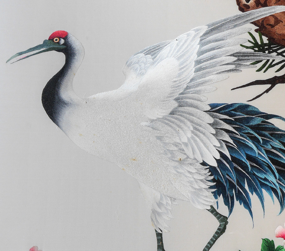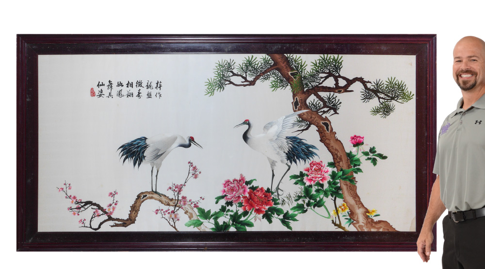 LARGE JAPANESE CRANES IN TREES EMBROIDERY: Silk embroidery figures of 2 cranes in tree branches with floral decoration, signed or marked with verse upper left, sight size approx. 36'' x 76'', framed 43 1/4'' x 83 1/4''.