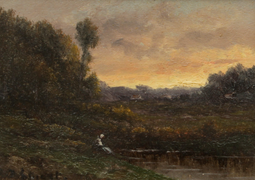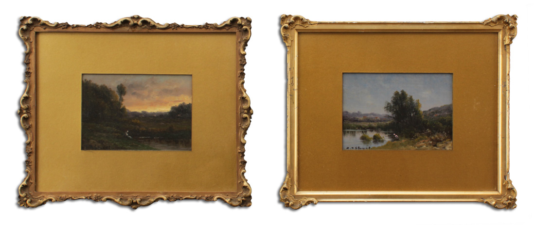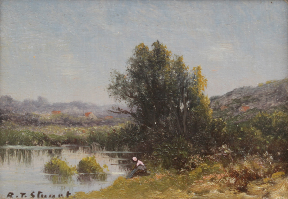 STUART, Robert T. (19th Century): 2 Miniature Landscapes, Both depicting a lone figure by a stream, Oil/Wood, 4'' x 5 1/2'', signed lower left, gilded frames, 9 1/2'' x 11 1/4''.