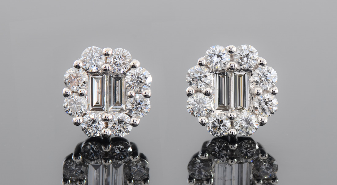 GREGG RUTH DESIGNER DIAMOND EARRINGS: 18K white gold in a round stud configuration of round brilliant and straight baguette diamonds totaling .90 Ct. of VS clarity and F-G color. Post and nut closure.