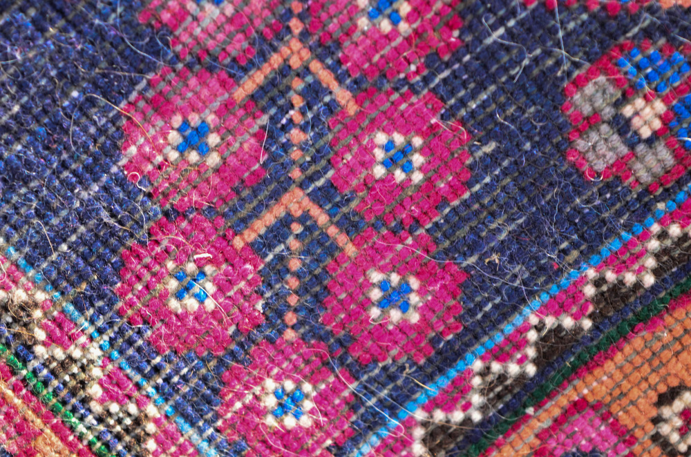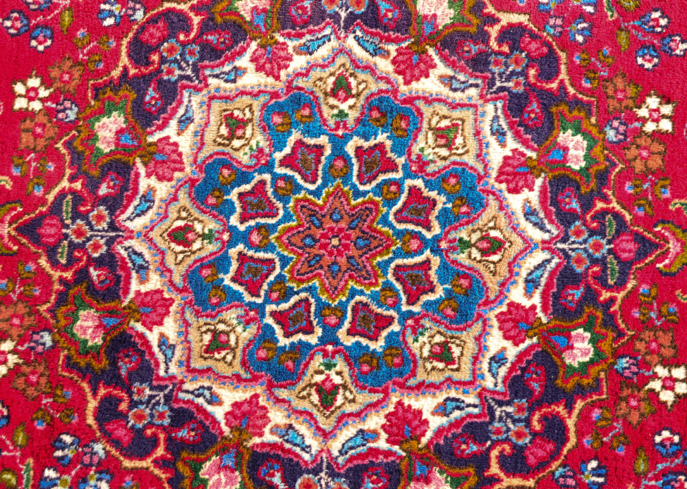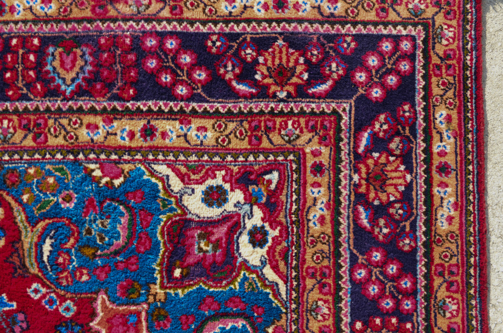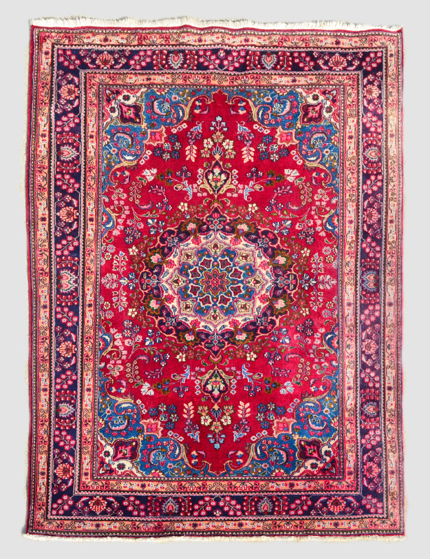 APPROX 20-40 YR OLD PERSIAN HAND KNOTTED WOOL RUG, 6'4'' x 9'5'': This rug has a large round central medallion done mainly in white and turquoise. This rests on a bright red field that is further covered with sprays of flowers. The four corners of the field repeat the turquoise and white of the center. The deep blue main order has design of palmettes alternating with small sprays of flowers.
