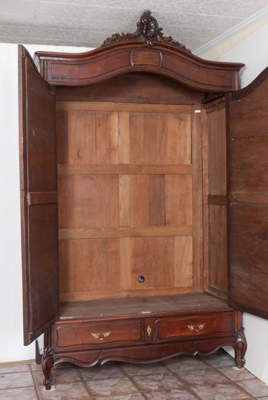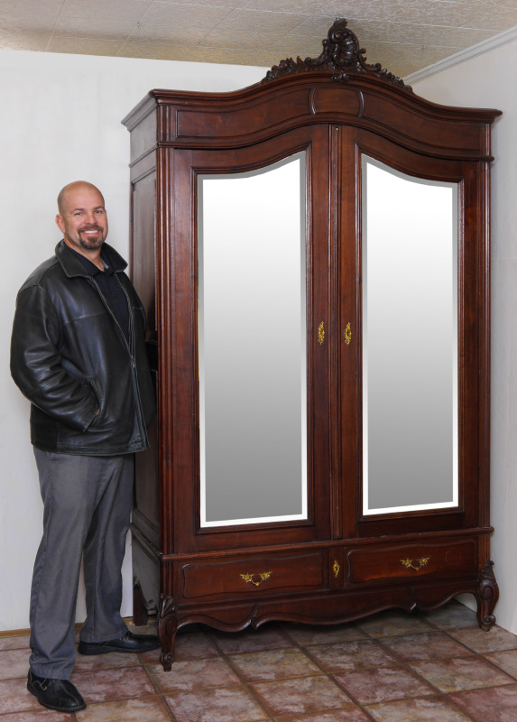 CARVED FRENCH ARMOIRE: Shaped crest with foliate scroll, doors with shaped beveled glass mirrors, paneled sides. Overall measures 94 1/2'' h. x 56'' x 25''.