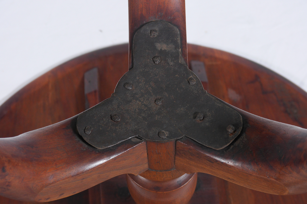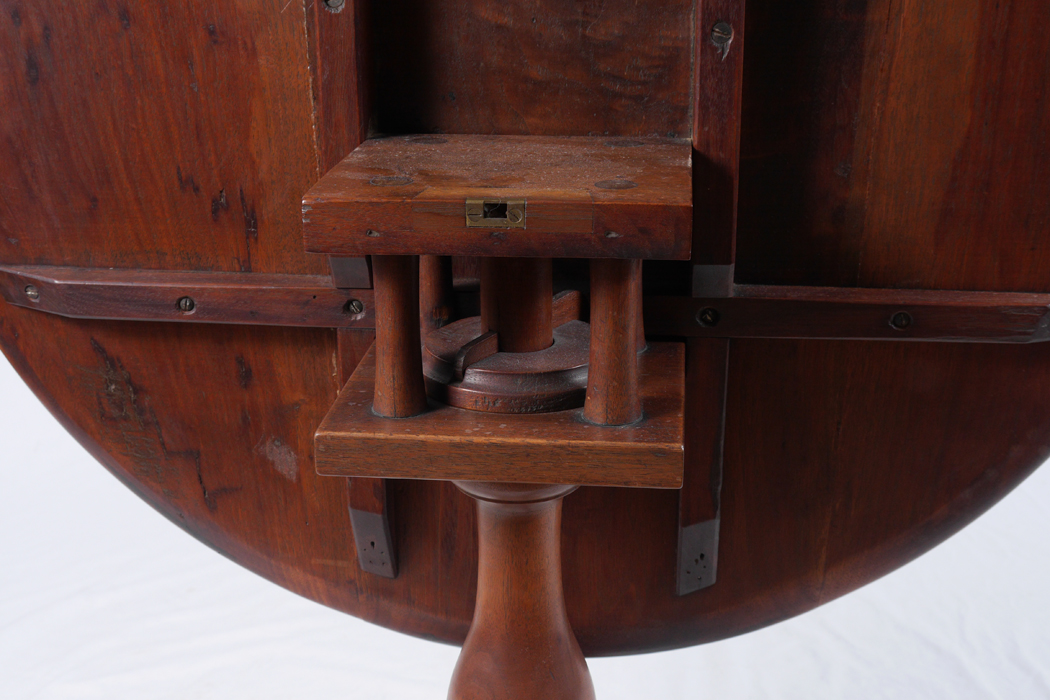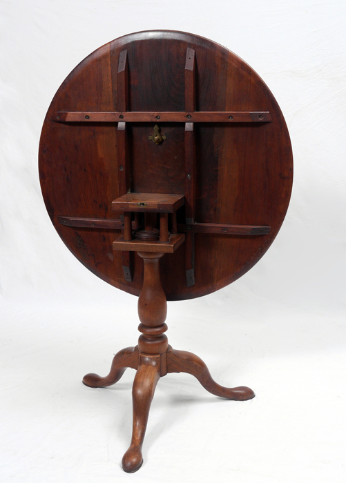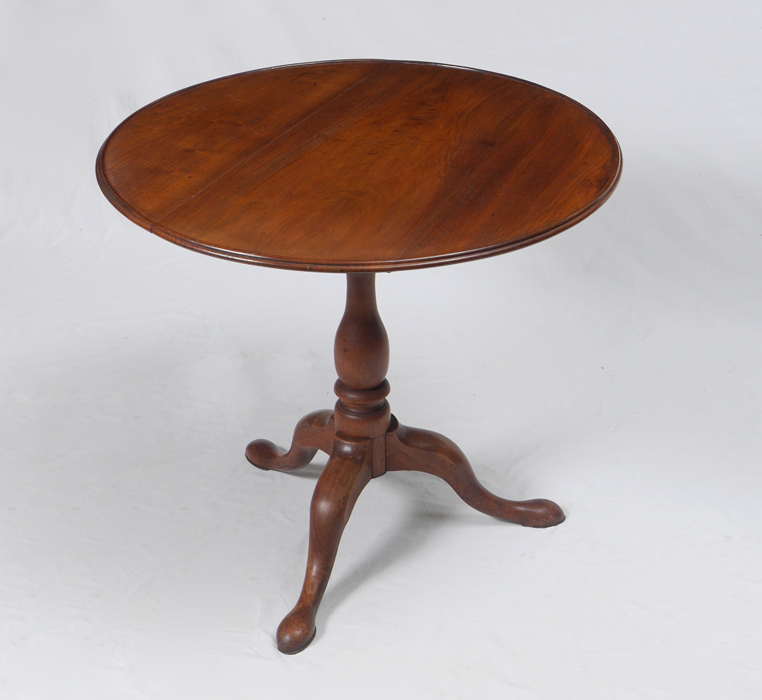 LATE 18TH CENTURY MAHOGANY TILT TOP BIRDCAGE TABLE: Fine pad foot table with circular three board top with molded edge, 31 1/2'' in diameter, 28 1/4'' h. when open, 46 1/4'' h. when tilted.