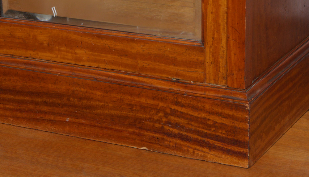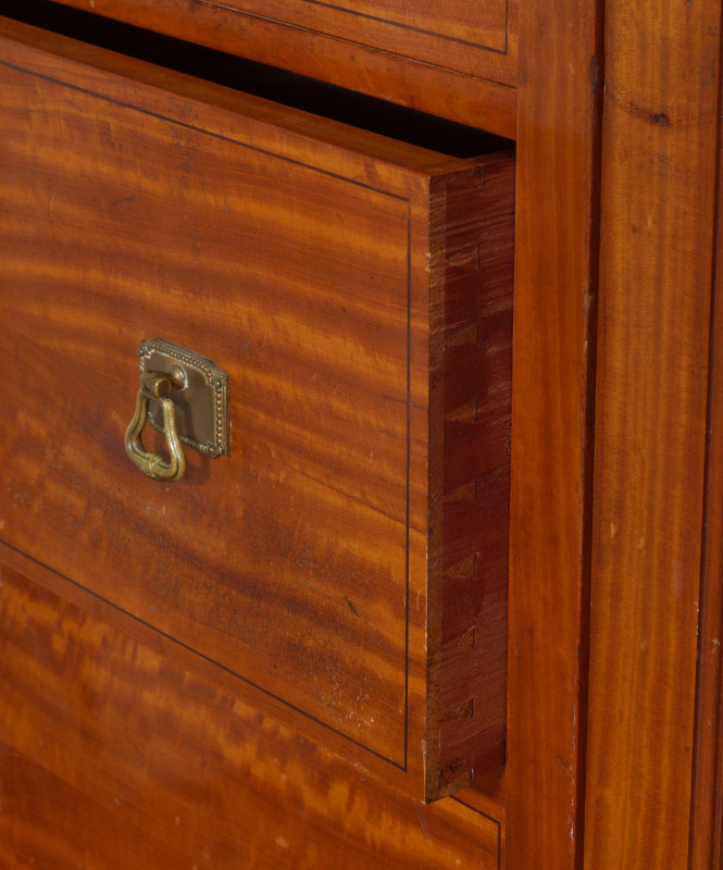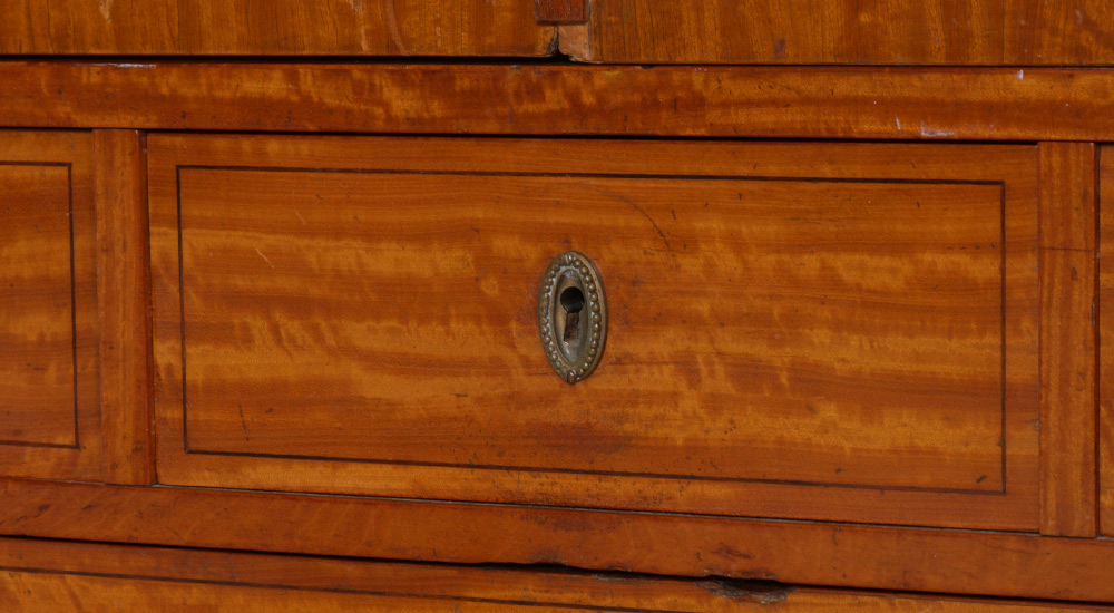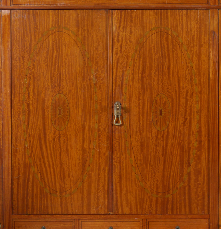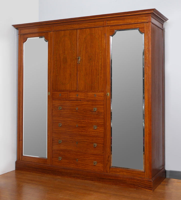 LARGE INLAID ARMOIRE: Center section with 2 marquetry inlaid doors over 3 drawers over 4 full drawers. Mirrored beveled glass doors either side with fittings for rods and brackets for shelves. Overall measures 86 1/2'' h. x 87 1/2'' x 27''.