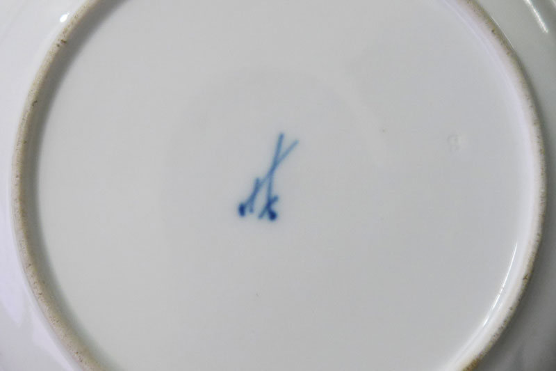 MEISSEN FLORAL HAND PAINTED CABINET PLATE: Scalloped gilt border, deep burgundy ground with hand painted floral decoration, back with underglaze blue crossed swords Meissen mark, 8 1/4''.