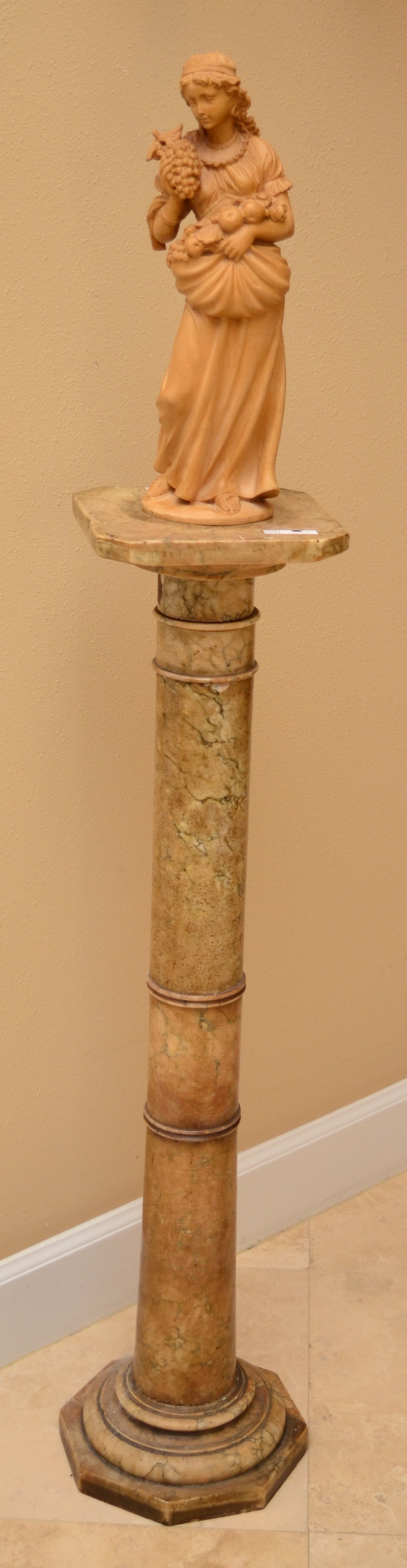 CARVED WOOD MAIDEN & MARBLE PEDESTAL: Carved wood figure of a maiden holding fruit, signed on base T. Bosshardt, 15'' h. x 6''. Sold with a marble pedestal, 38 1/4'' h. x 8 1/4''. CONDITION: Chip to base of skirt on maiden, several chips to pedestal.