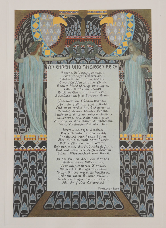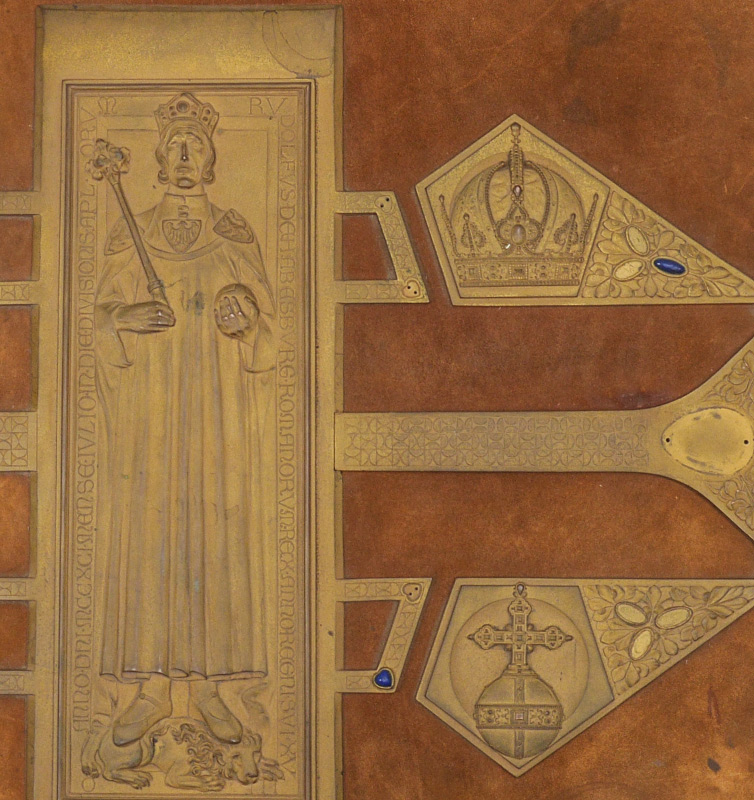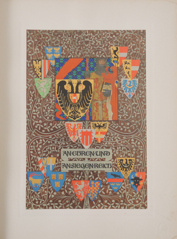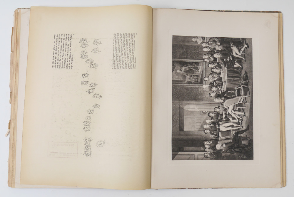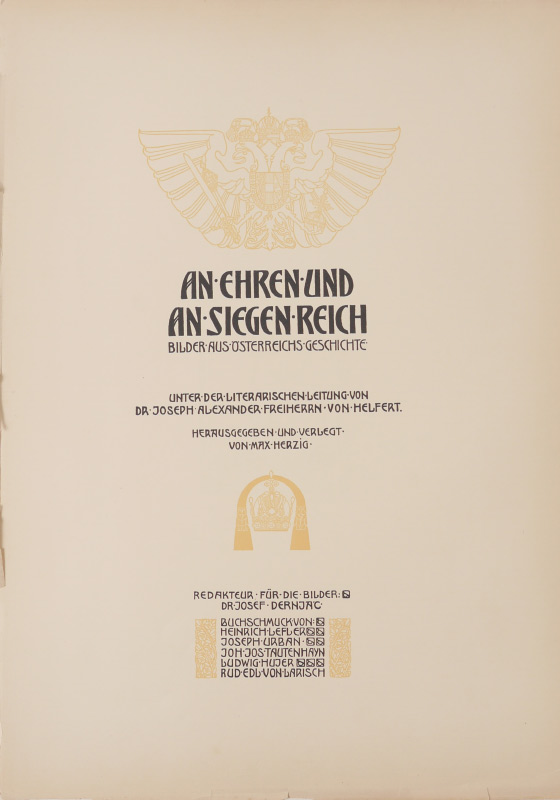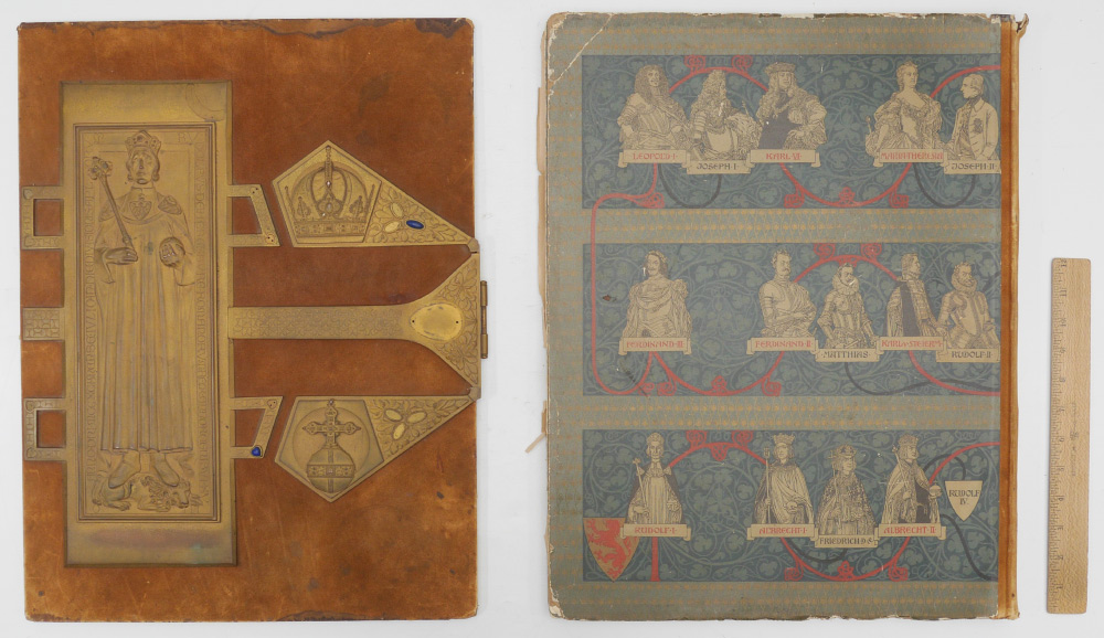LARGE MAX HERZIG AUSTRIAN BOOK OF ENGRAVINGS: Full title ''An Ehre Und An Siegen Reich, Bilder Aus Osterreichs Geschichte'', published by Max Herzig, Vienna. Collection of historical engravings and prints, many pages with blind stamp, pages of illuminated and standard text, bound in leather cover with heavy gilt bronze accents applied to top cover. Overall measures 20 1/4'' x 15 1/4'' x 1 3/4''.