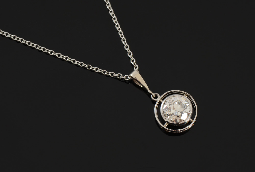 PLATINUM DIAMOND SOLITAIRE PENDANT NECKLACE: Old European round cut diamond, .80 Ct. bezel set in platinum, rated I1 clarity and K color. 16'' chain. Sold with current Atlanta Gemological GIA graduate's appraisal for $2500.