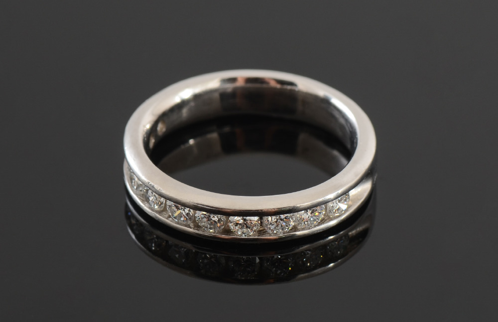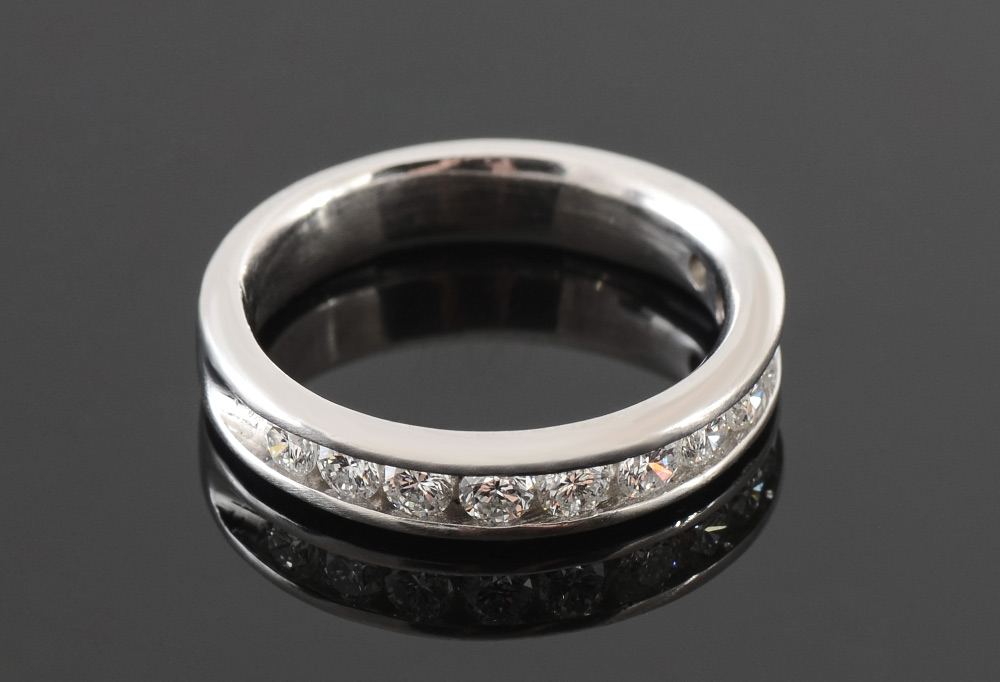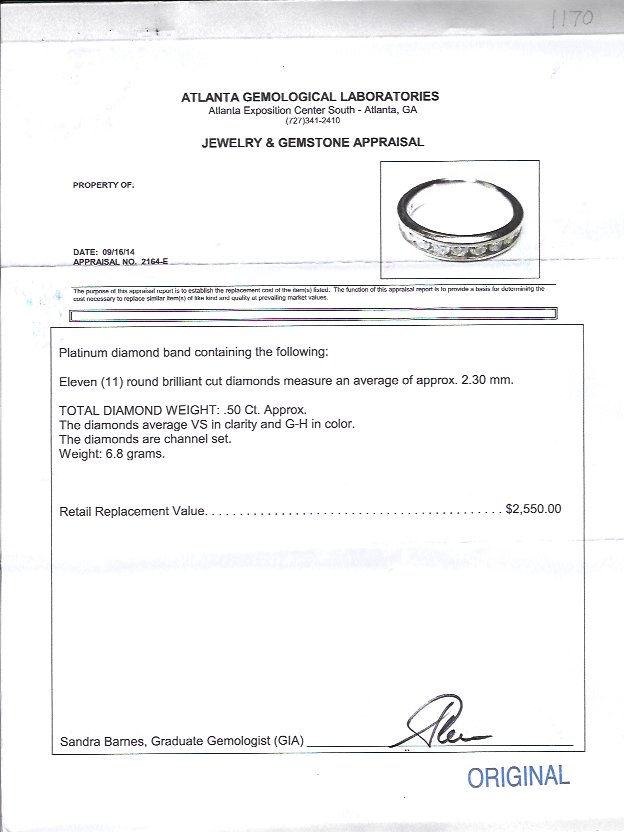 PLATINUM DIAMOND WEDDING BAND: Eleven round brilliant channel set diamonds totaling approx. .50 Ct., averaging VS clarity and G-H color. Size 6. Weight 6.8 grams. Sold with 2014 Atlanta Gemological GIA graduate's appraisal for $2550.