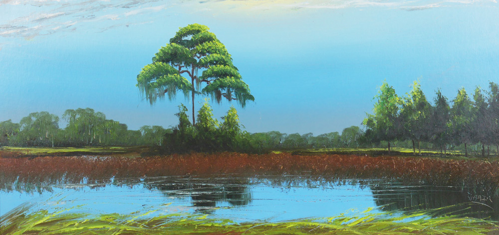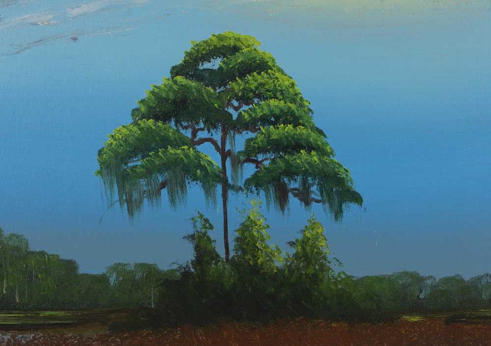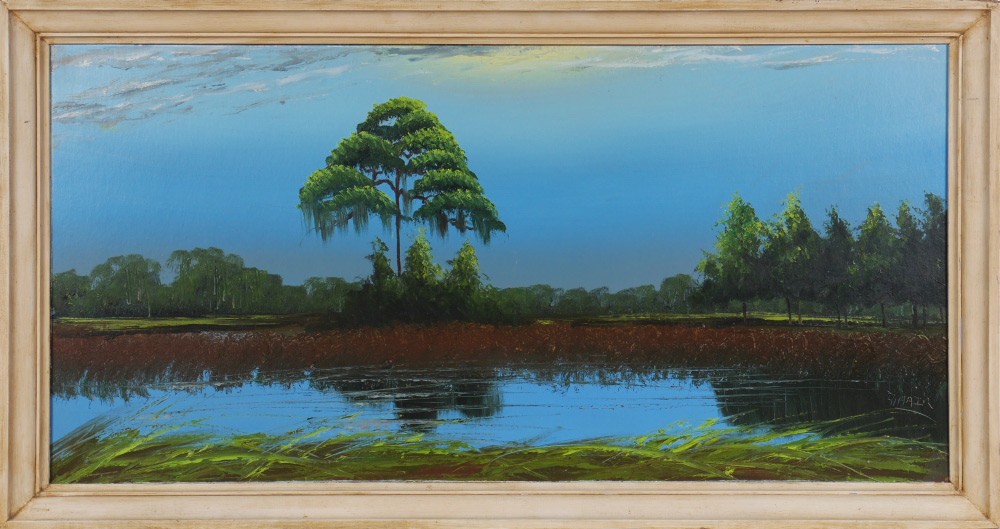 HAIR, Alfred, (American, 1941-1970): Florida Highwaymen moonlight backwaters scene with single tree stand and water, Oil/Upson, signed lower right, 24'' x 48'', framed 27 1/4'' x 51 1/4''.