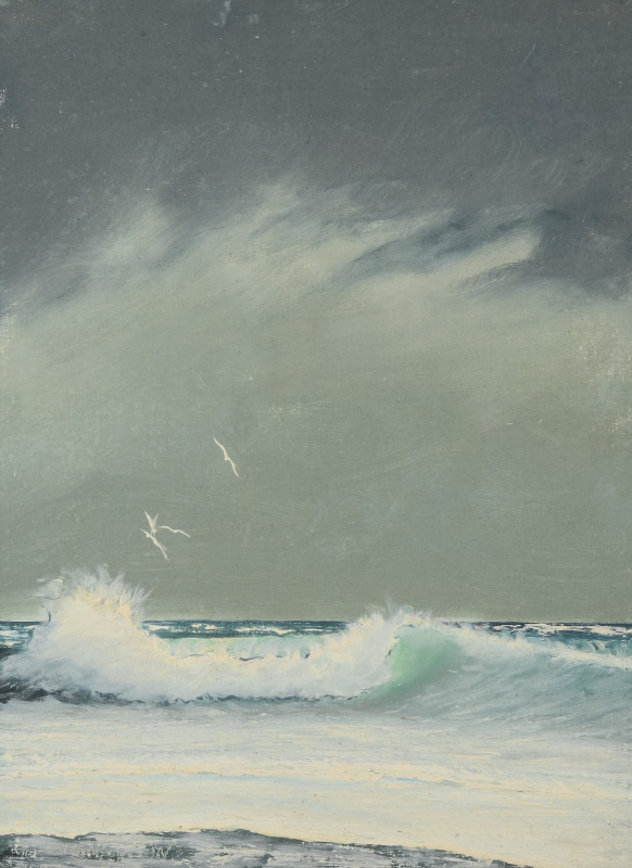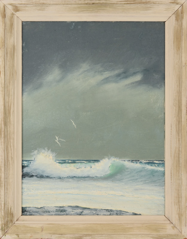 NEWTON, Harold, (American, 1934-1994): Florida Highwaymen surf scene with stormy skies, 3 seagulls in flight, Oil/Canvasboard, 24'' x 18'', signed lower right, framed 28 1/4'' x 22 1/2''