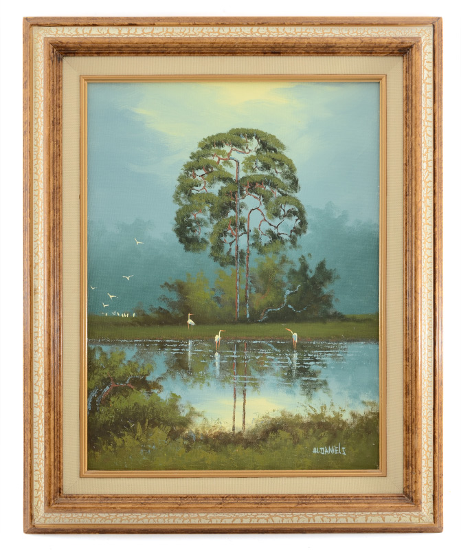 DANIELS, Willie, (American, 20th Century): Florida Highwaymen Everglades backwater scene with trees and birds, Oil/Canvasboard, 16'' x 12'', signed lower left, framed 20 3/4'' x 16 3/4''.