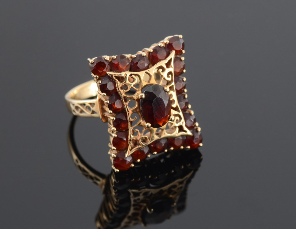 FILIGREE GARNET RING: 14k yellow gold ring centers an oval 7 x 5 mm garnet framed by 18 round garnets. Size 7.5. Weight 5.5 grams.