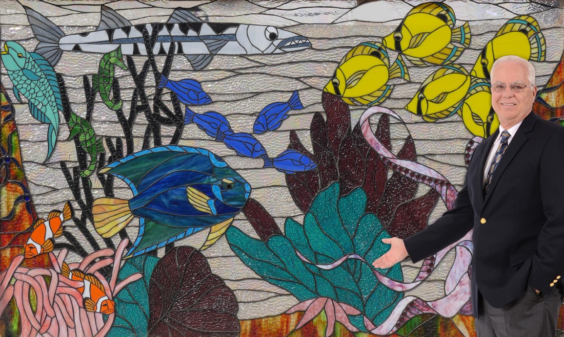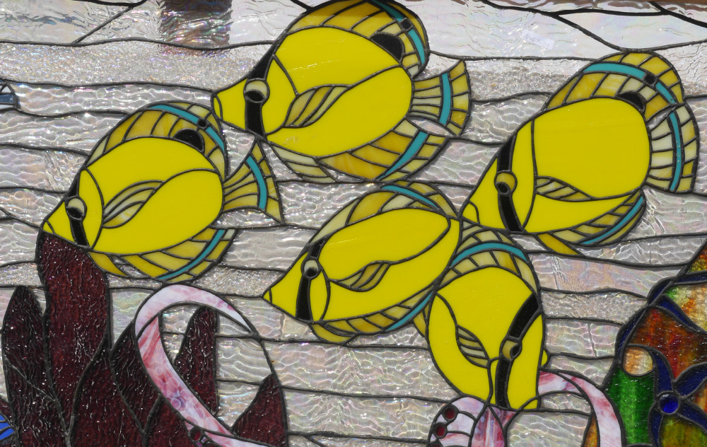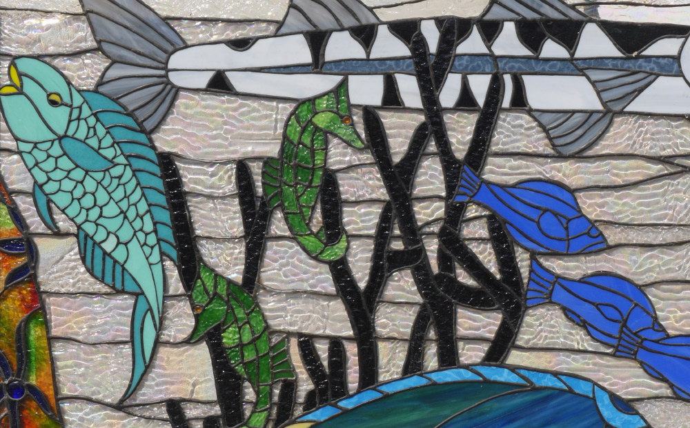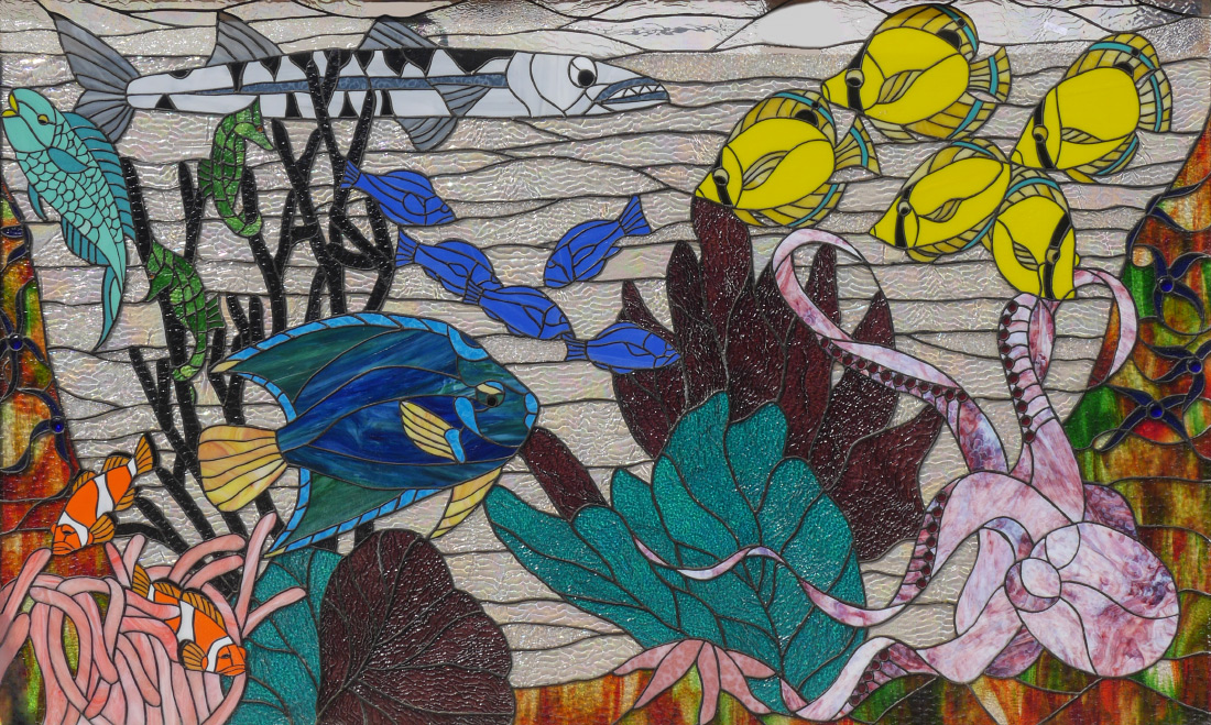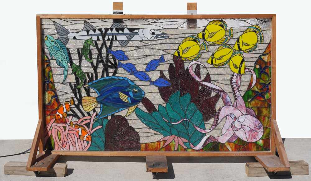 NOREEN HOAGLAND LARGE STAINED GLASS WINDOW: Tropical underwater scene designed by Noreen Hogland featuring barracuda, clownfish, parrotfish, octopus and more. Measures approx. 51 3/4'' x 89 3/4''. Currently housed in a wood frame on wheels, no supporting rods and suggested that it remains and be transported in this frame.