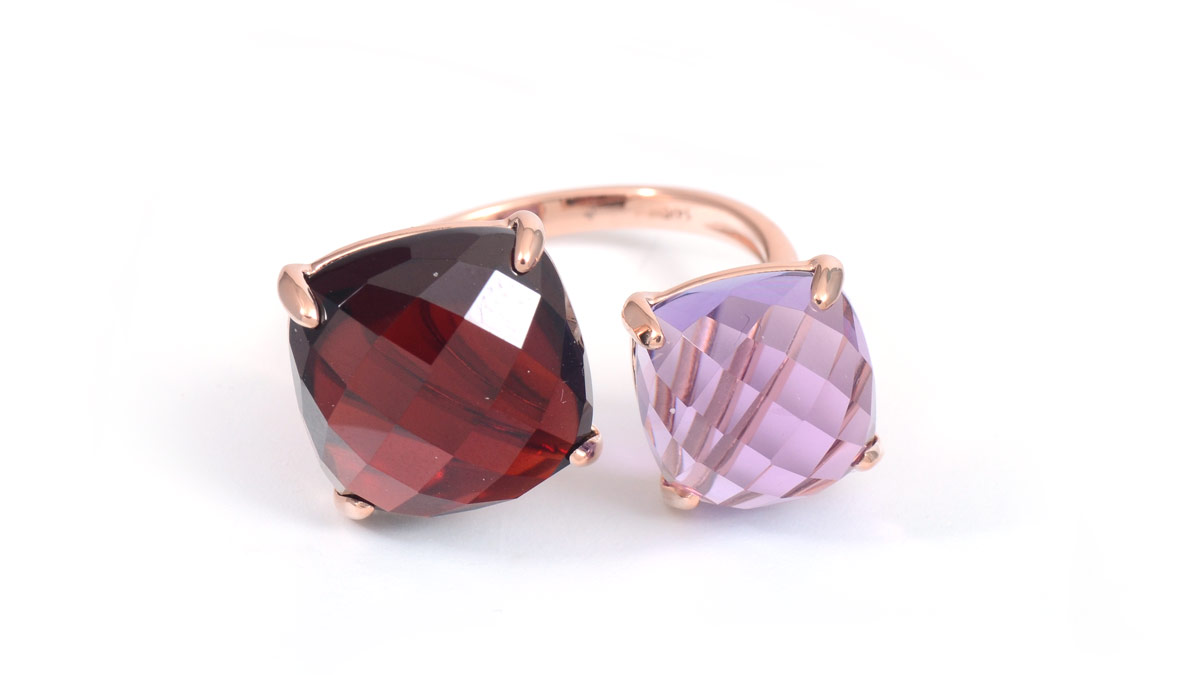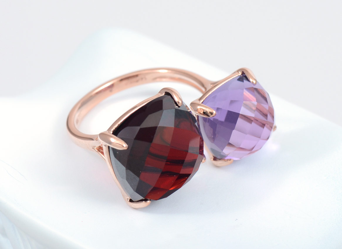 GARNET AND AMETHYST RING: 14K rose gold 2 stone ring. One square shaped mixed cut garnet, approx. 10.23 Ct. and one square cushion cut amethyst approx. 4.20 Ct. Prong set. Size 6.5. Weight 5.4 grams.