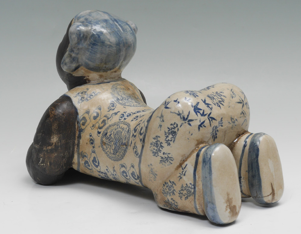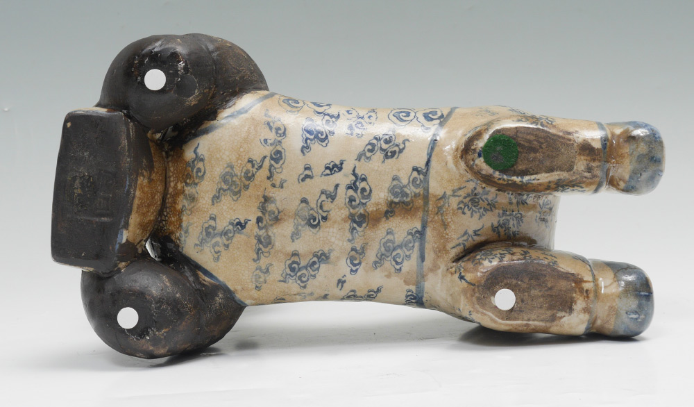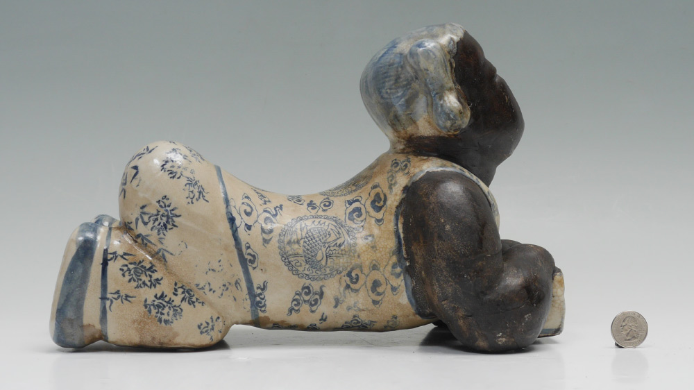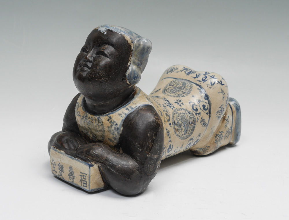 CHINESE FIGURAL BOY HEAD REST / PILLOW: Earthenware figure of a kneeling boy, typically used as a nick rest or pillow. Blue decorated outfit and hair, brown glaze face and arms. Spurious seal under arms. Overall measures 8 1/2'' h. x 7 1/2'' x 13''.