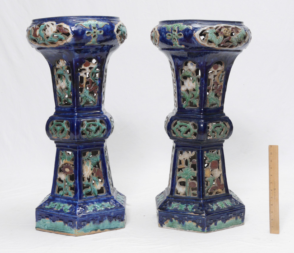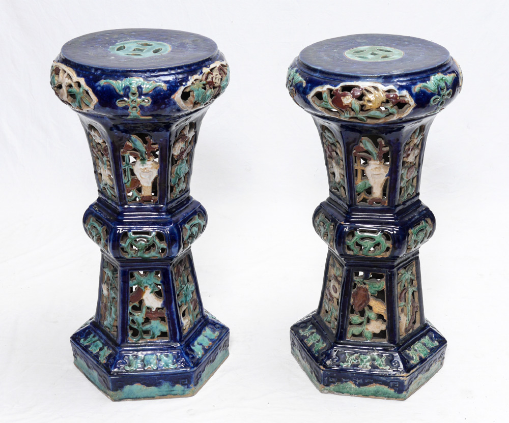 PAIR CHINESE MAJOLICA PEDESTALS: Polychrome tin glazed, measures approx. 29'' tall, 14'' dia.