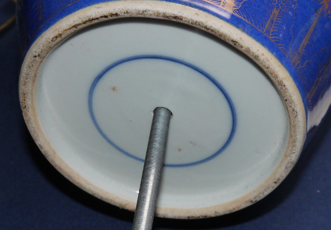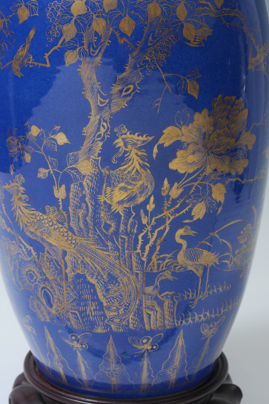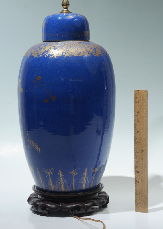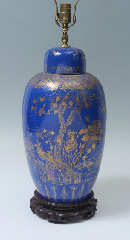CHINESE GILT DECORATED POWDER BLUE GLAZED PORCELAIN LAMP: 2 part Ginger jar form body with blue glaze, gilt bird and foliate decoration. Circle mark to porcelain base. Lamp affixed to carved wood base, overall to top of single socket 24 1/2'' h. x 9 1/2''. Sold with the harp.