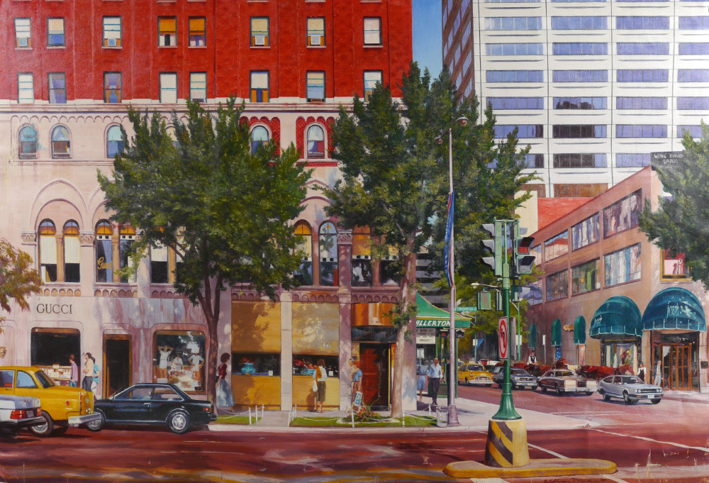 NELSON, William, (American, 1942-): Chicago Street Scene at the Corner of Michigan Ave, Allerton Hotel and Gucci, Oil/Canvas, unstretched, 38'' x 58'', signed lower right and dated '84. Original receipt for $10,000, from Jean-Paul Loop Gallery in Chicago, 1985.