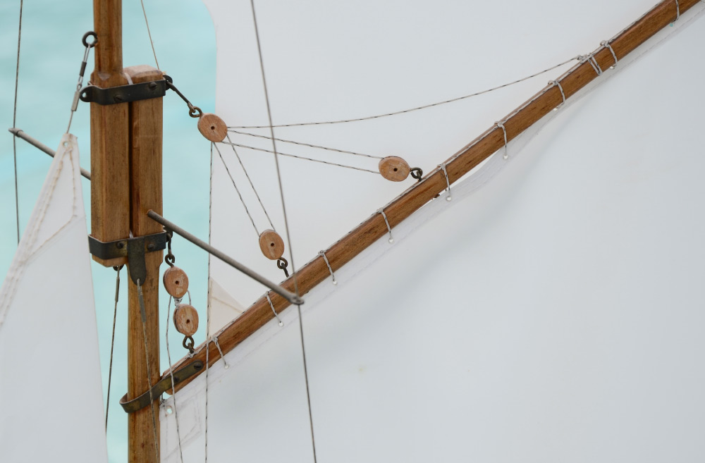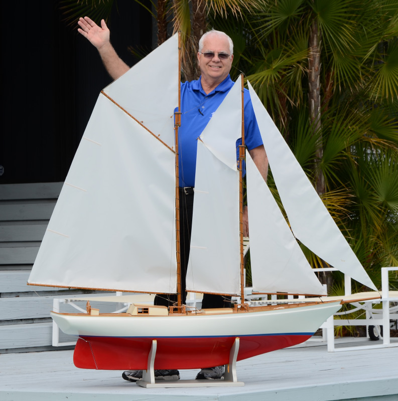 LARGE SAILING BOAT MODEL: Dual mast sailboat with spot for radio controlled engine to control sails, engine currently missing. Complete with rigging and sails, hull with white over red. Measures 65 1/4'' h. x 66'' x 16'', sold with stand 9'' h. x 19'' x 12''.