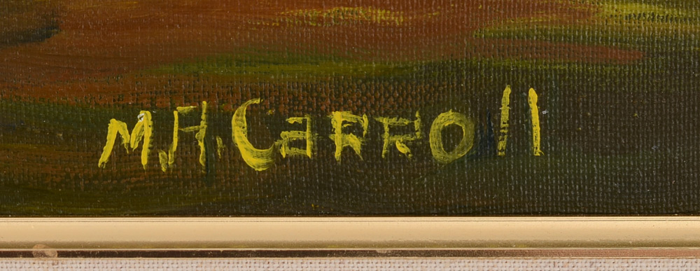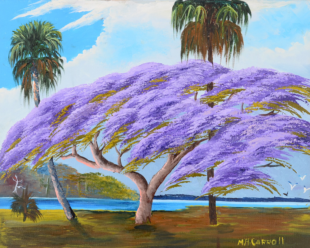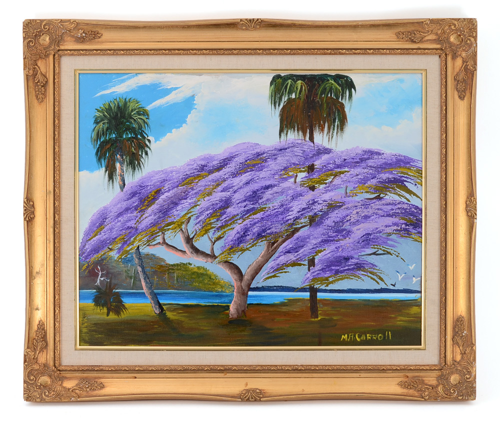 CARROLL, Mary Anne, (American, 20th Century): Florida Highwaymen purple Poinciana at water edge, Oil/Canvas, 16'' x 20'', signed lower right, framed 21 1/2'' x 25 3/4''.