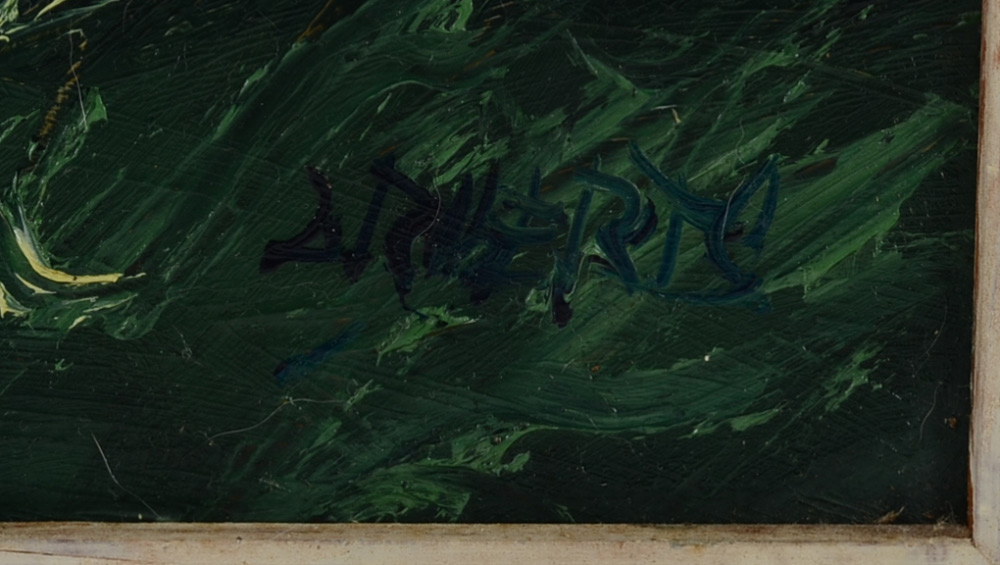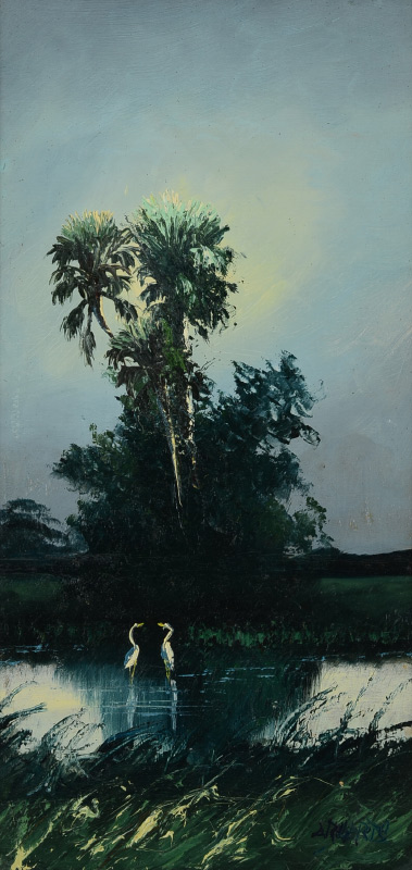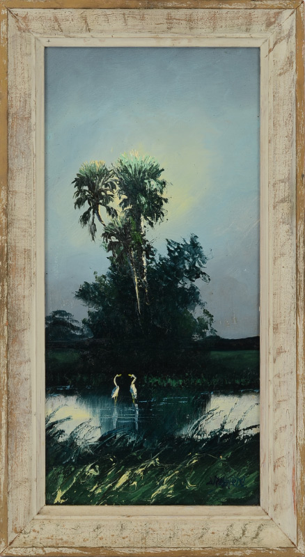 ROBERTS, Livingston, (American, 20th Century): Early Florida Highwaymen Moonlight Everglades scene, Oil/Upson, 24'' x 12'', signed lower right, framed 27 1/4'' x 15 1/2''.