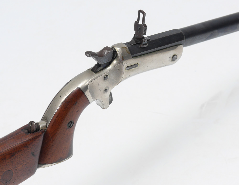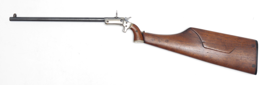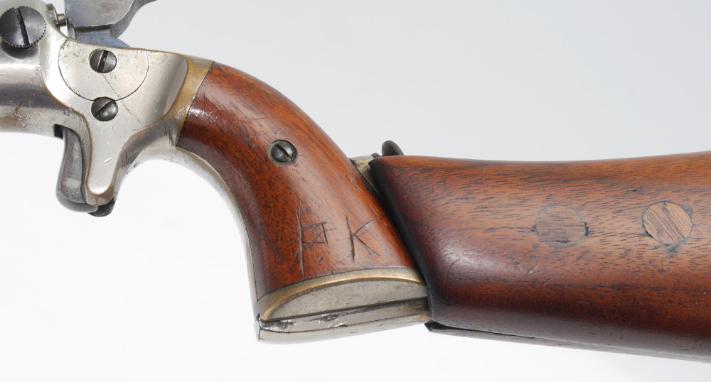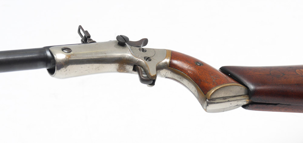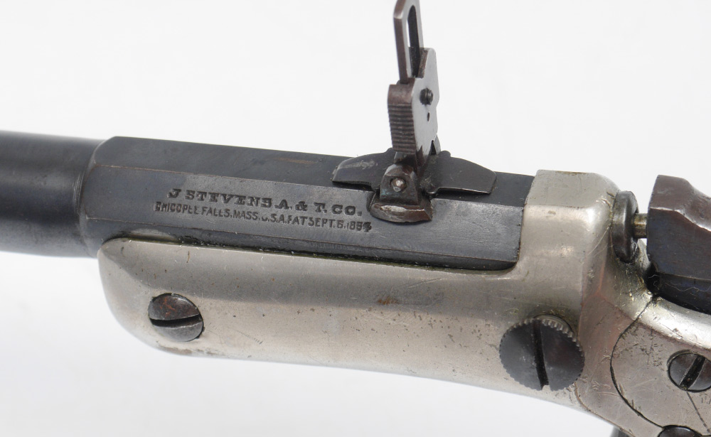 J. STEVENS ARMS ANTIQUE NEW MODEL POCKET RIFLE #40 WITH WOOD STOCK: Antique pistol with a 15'' part octagon, part round approx 22 cal. barrel marked J. Stevens A & T Co. Chicopee Falls Mass Pat. Sept. 16 1864. Nickel plated medium frame. Break front action nice and tight. Wood grips with custom wood detachable shoulder stock. Previous owner's initials scratched into grips.