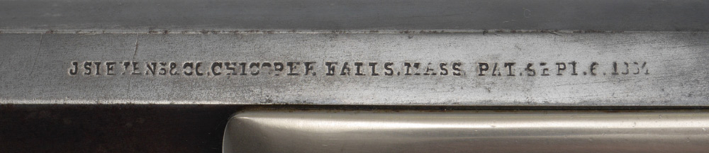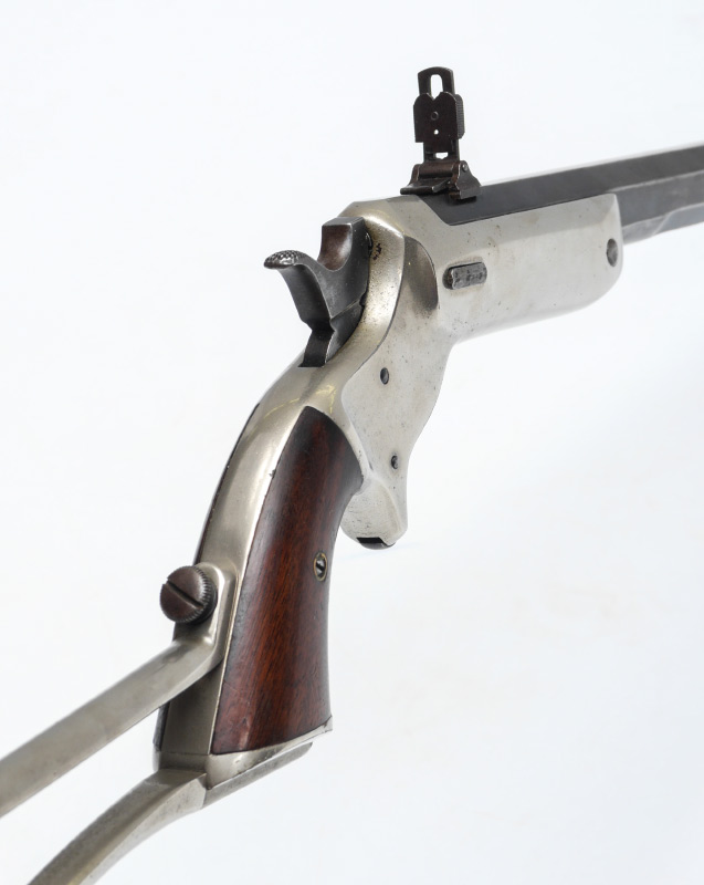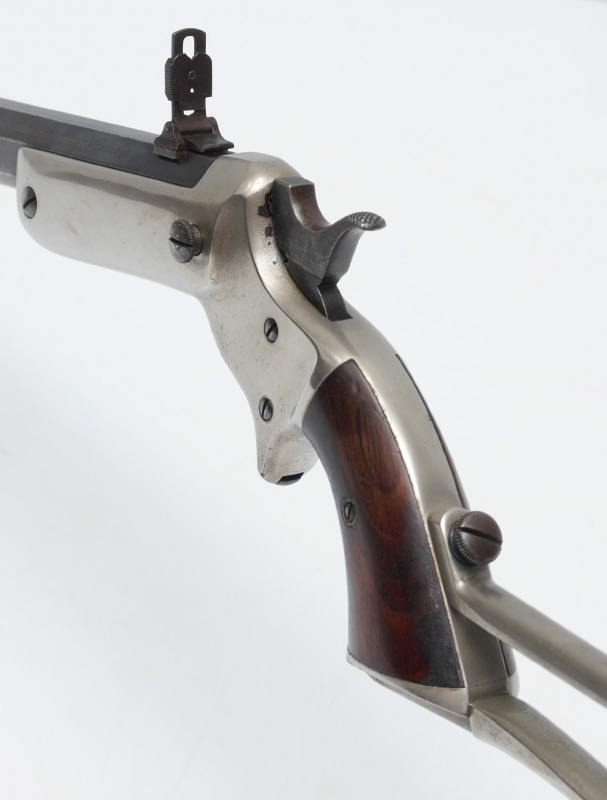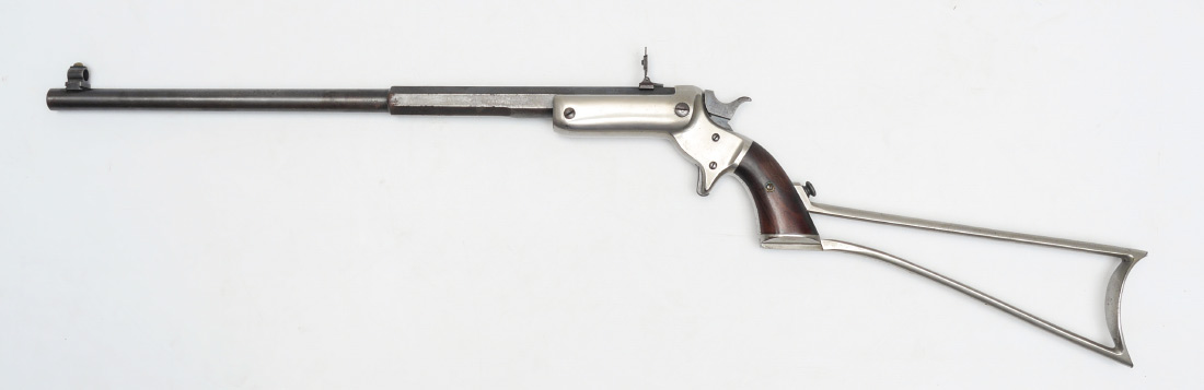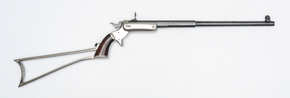 J. STEVENS & CO. ARMS ANTIQUE PET POCKET RIFLE #34: Antique target pistol with 18'' part octagon, part round approx 22 cal. barrel marked J. Stevens & Co. Chicopee Falls Mass Pat. Sept. 6. 1864. Heavy 1 1/4'' frame. Walnut grips and detachable metal shoulder stock. Break front action nice and tight. All original.