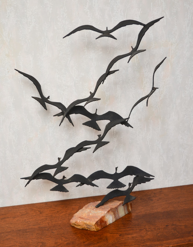 BAHAR, Bijan, (American, 20th C.): Curtis Jere style bird sculpture, Welded Metal and Stone flock of gulls, 32'' h x 24'' w. x 10'' d.