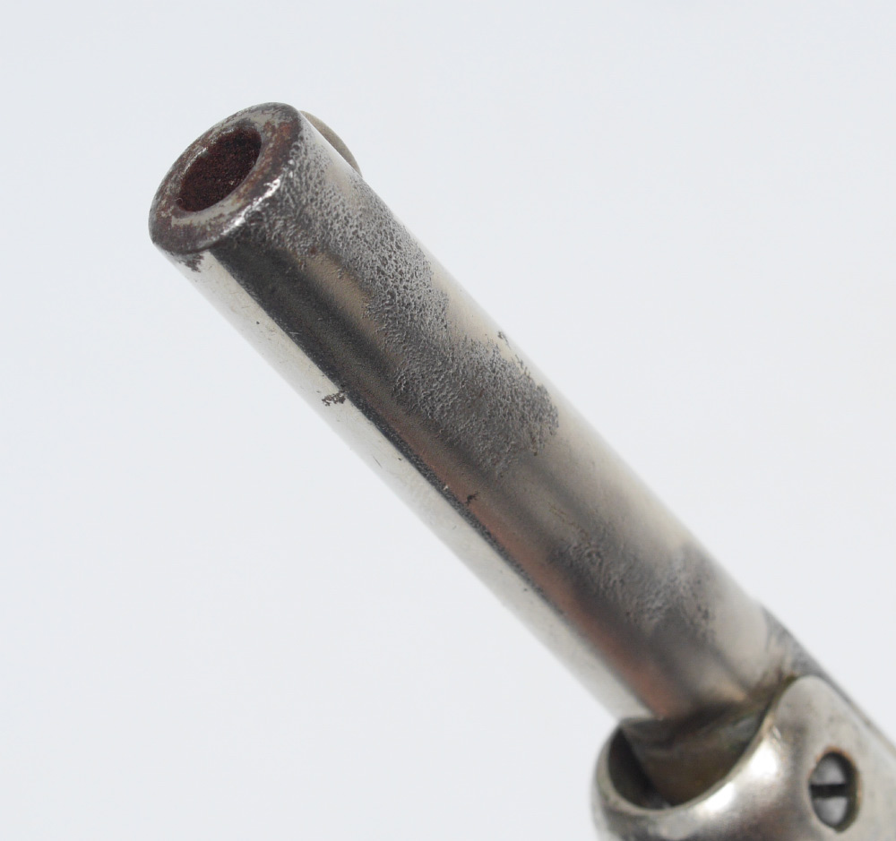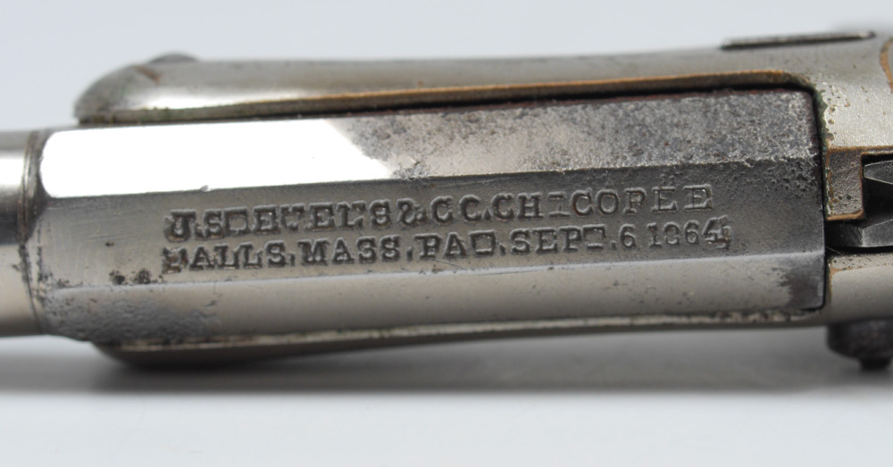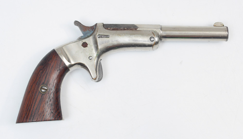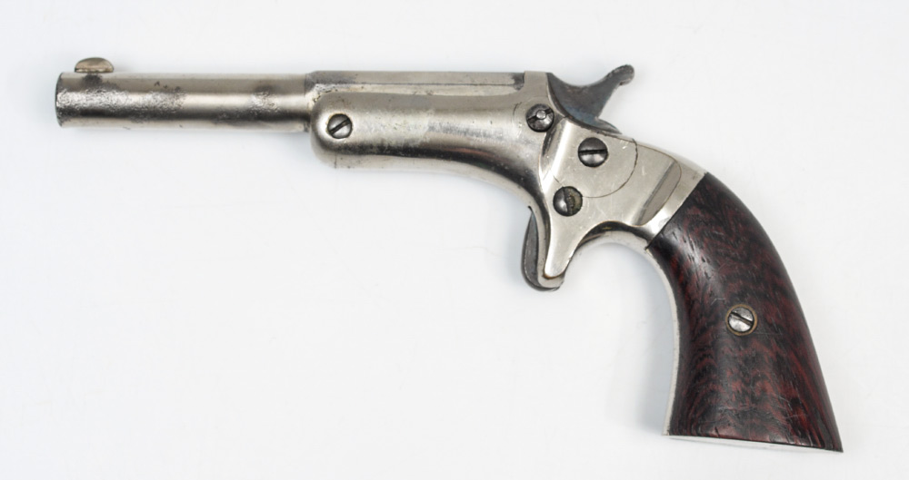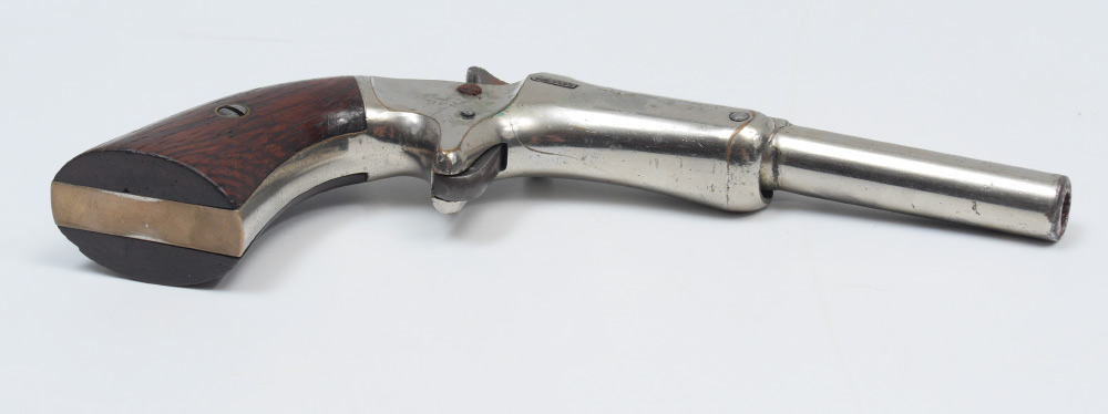 J. STEVENS ARMS ANTIQUE OLD MODEL POCKET PISTOL: Antique pistol with 3 1/2'' part octagon, part round approx 22 cal. barrel marked J. Stevens A & T Co. Chicopee Falls Mass Pat. Sept. 6 1864. Wood grips. Nickel frame with some nickel loss. Break front action nice and tight.