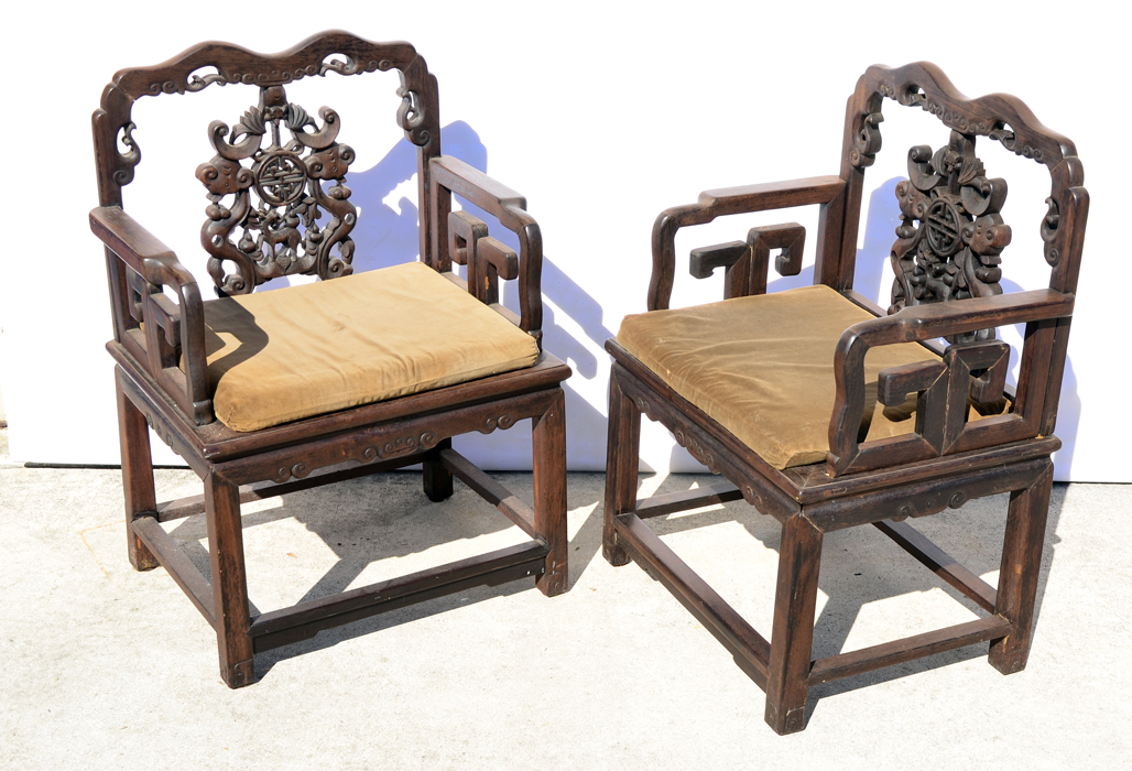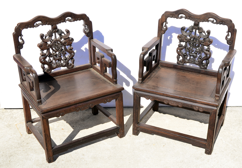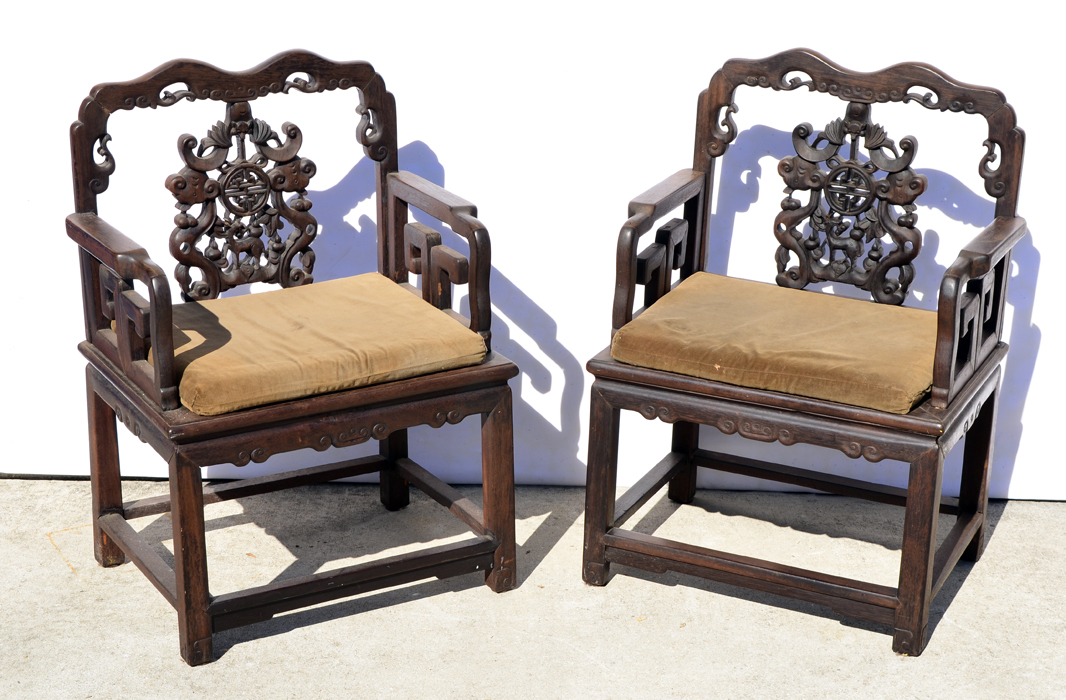 PR RICHLY CARVED 19TH C CHINESE ROSEWOOD SIDE CHAIRS: Extraordinarily heavy, 19th C carved rosewood side chairs. Carving depicts fox heads, full bodied deer and oriental medallion carvings. Through tenon construction. Approx. 35''h x 24''w x 18''d.