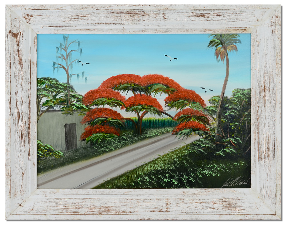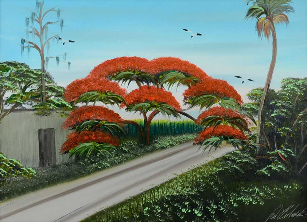 BLACK, Al, (American, 20th Century): Florida Highwaymen red Poinciana with shack by the road, Oil/Masonite, 18'' x 24'', signed lower right, framed 22 3/4'' x 29 1/4''.