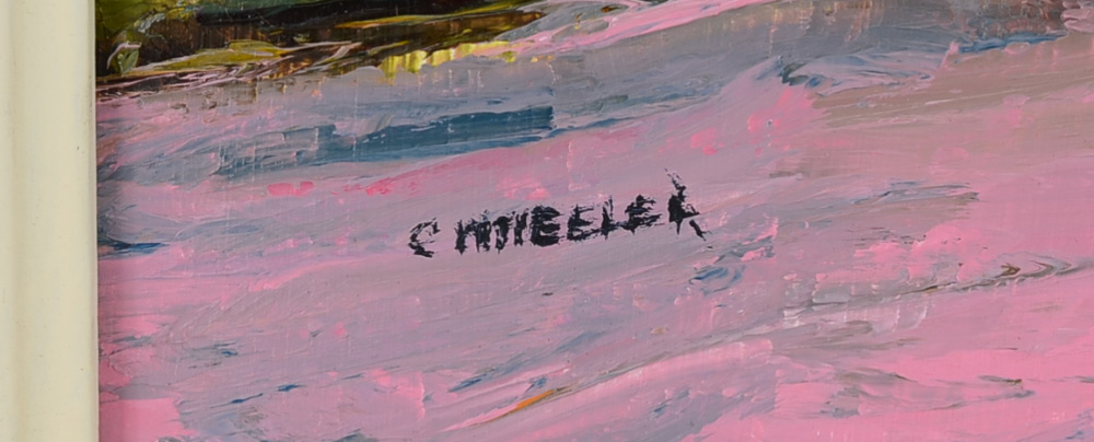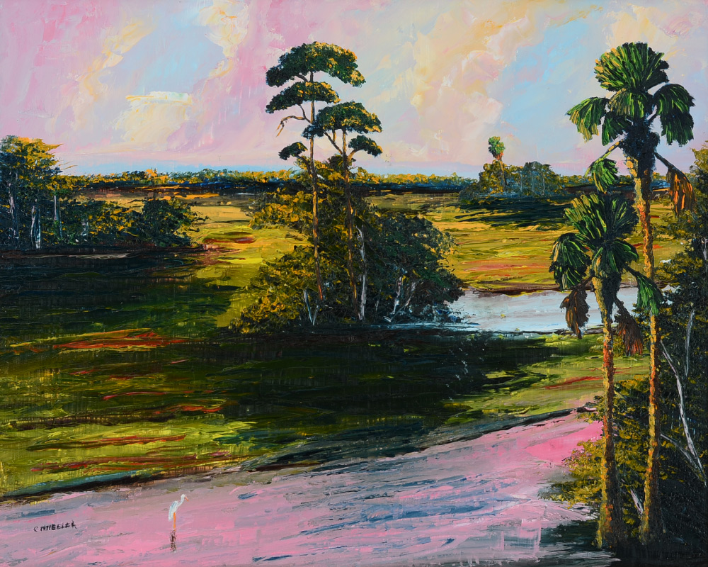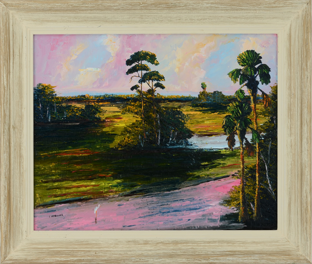 WHEELER, Chico, (American, 20th Century): Florida Highwaymen pink savannah sky backwater scene, Oil/Masonite, 16'' x 20'', signed lower left, framed 20 3/4'' x 24 3/4''.