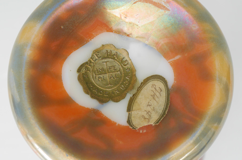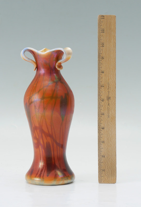IMPERIAL IRIDESCENT ART GLASS VASE: Iridescent pulled heart design, corset shaped, bears the Free Hand Imperial foil label. Measures 9 1/2'' tall.