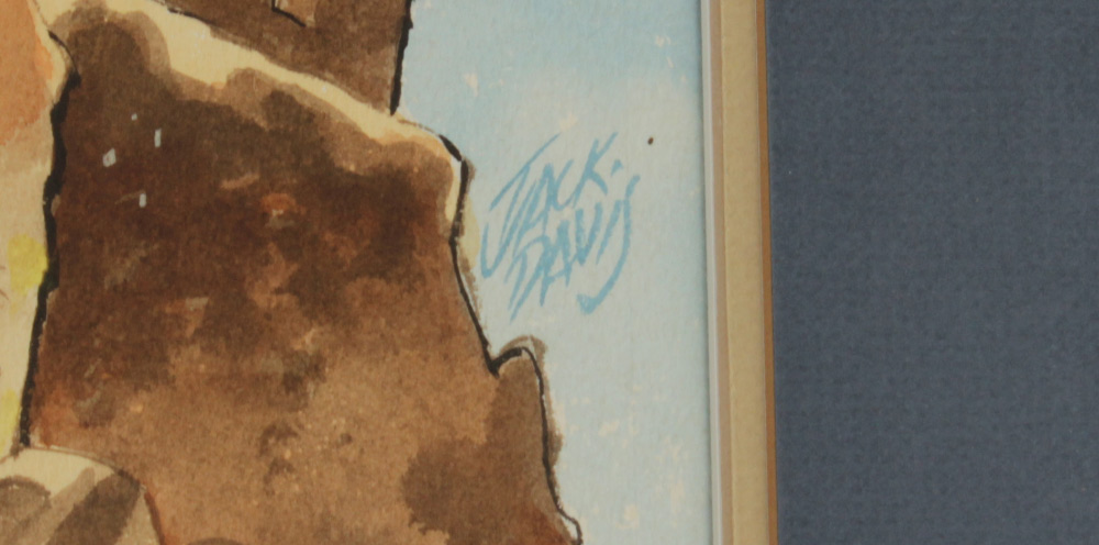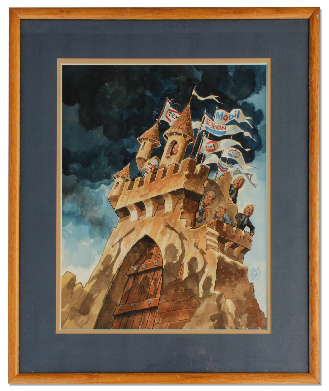 DAVIS, Jack, (American, 1926-): Satirical Illustration of Oil Industry Leaders atop a Castle, with Shadows of an Angry Mob Cast on the Wall, Watercolor, sight size 17'' x 13 3/3'', signed lower right, framed, 24 1/2'' x 21 1/4''.