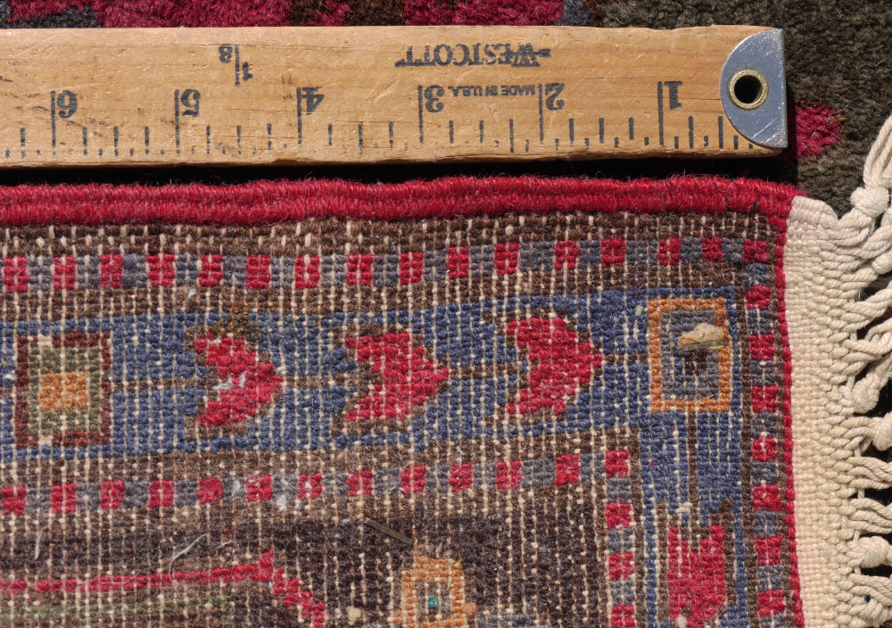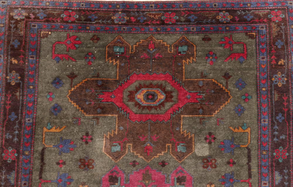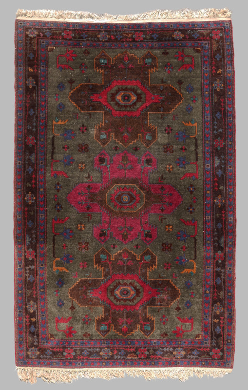 APPROX 25-35 YR OLD TURKISH HAND KNOTTED WOOL RUG, 4'5'' x 6'5'': This rug has an unusual but pretty color palette. The deep aqua green field has three large medallions that are done in a salmon pink, brown, aqua, and a grey-blue. The field also has a few scattered small design elements, but it is the medallions that predominate. The black ground main border is banded by blue-red guard borders. Condition is good.