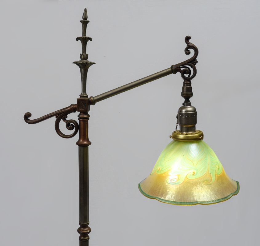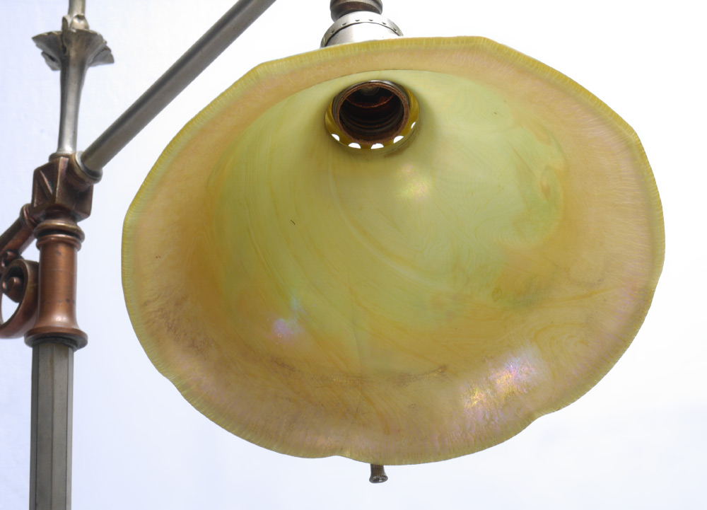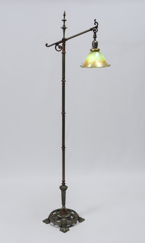 FLOOR LAMP WITH ART GLASS SHADE: Cast iron base with leaf form feet, metal body, single arm with single fixture. Attributed Quezal iridescent art glass shade with pulled feather design, 4 1/2'' h. x 8'', 2 1/4'' fitter rim.