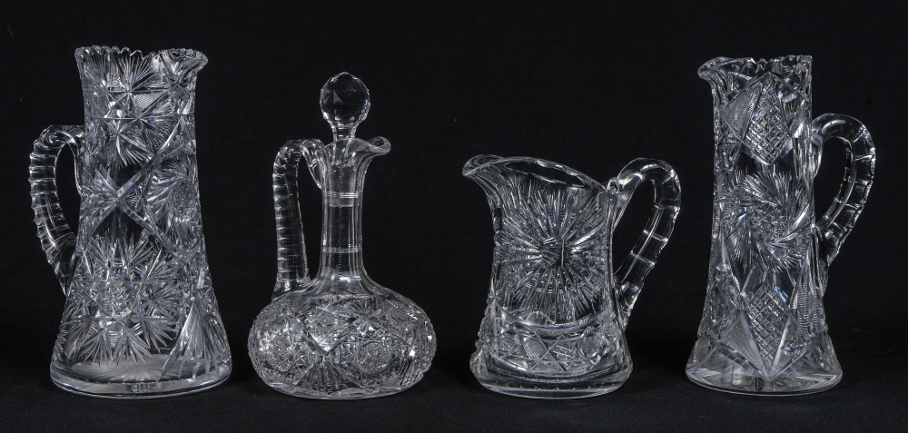 AMERICAN BRILLIANT CUT GLASS PITCHERS: Group of 3 pitchers and a decanter with stopper. Measures 8- 11 1/2'' tall.