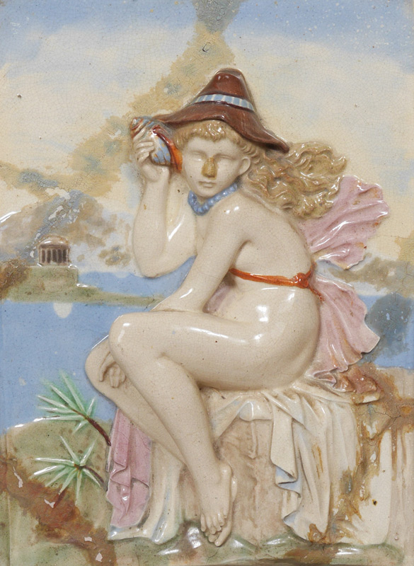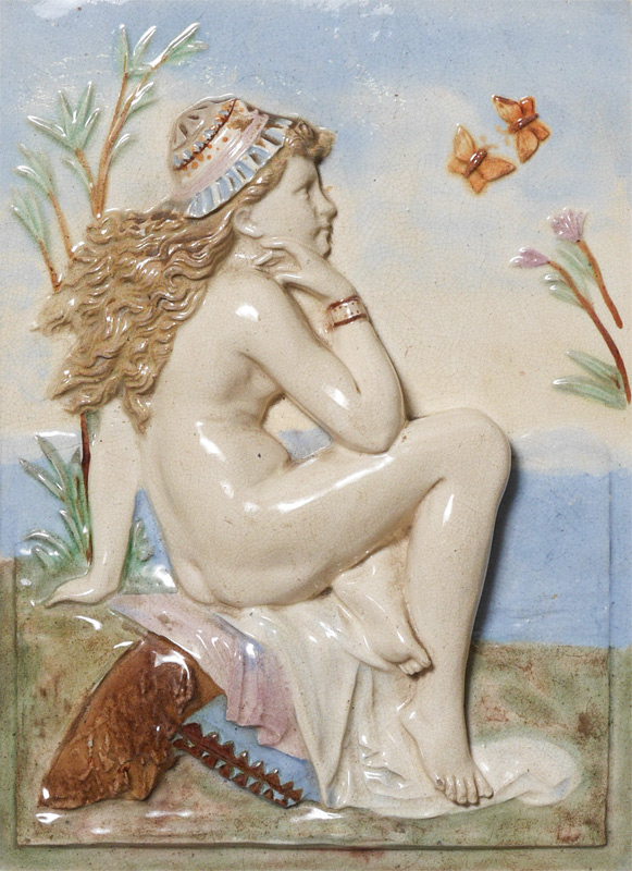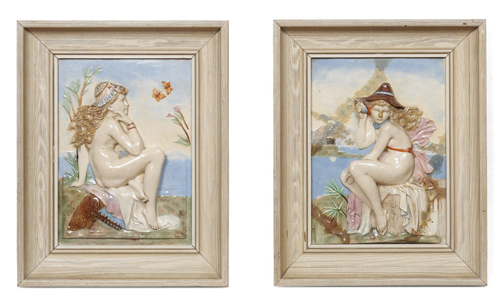 PAIR OF FIGURAL MAJOLICA PORCELAIN WALL TILES: Two young nudes relaxing at water side, no signature or mark found, each approx. 11'' x 8'', matching frames 14'' x 11.5'' x 1.75''.