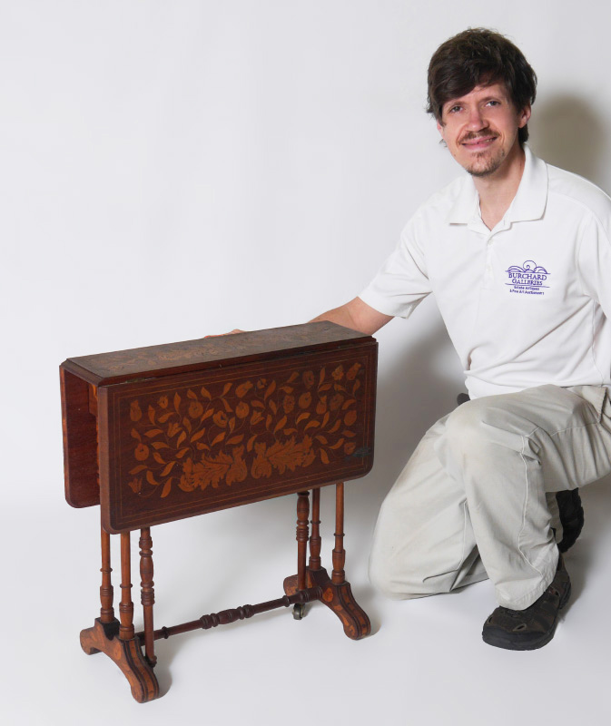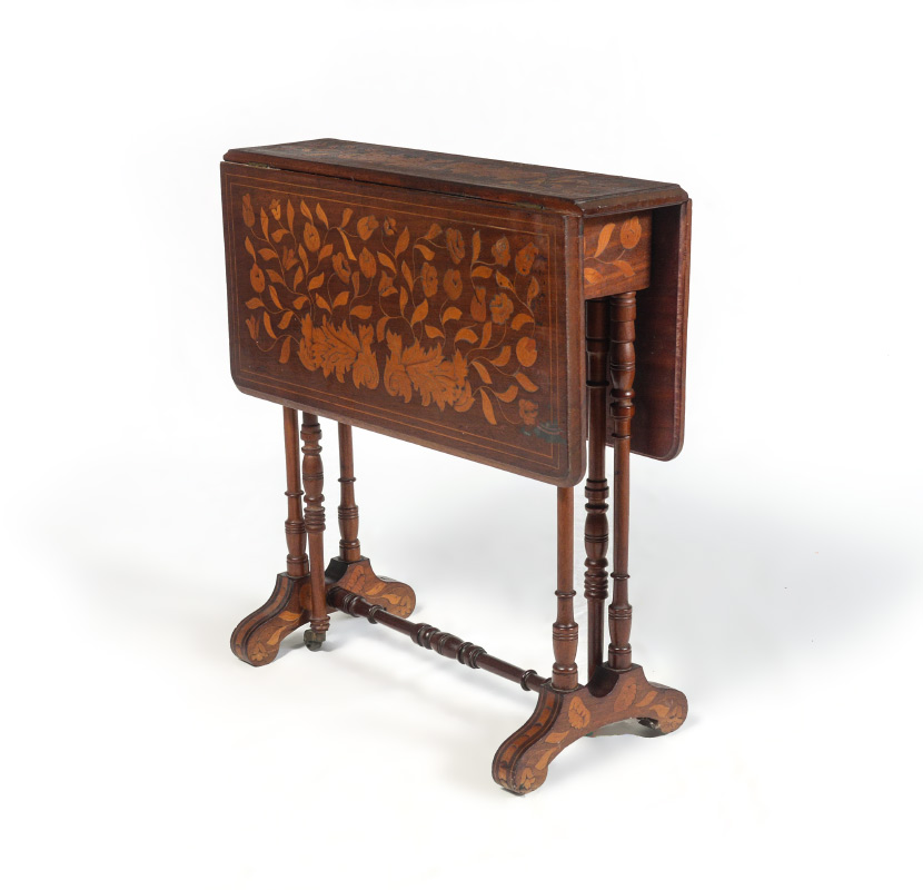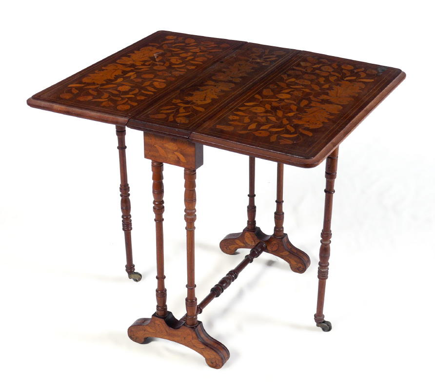 INLAID MARQUETRY GATE LEG TABLE: Floral marquetry inlaid top and drop leaves, turned support and stretcher, shaped feet. In leaves down position measures 22'' h. x 9 3/4'' x 21 3/4'', 10'' leaves.