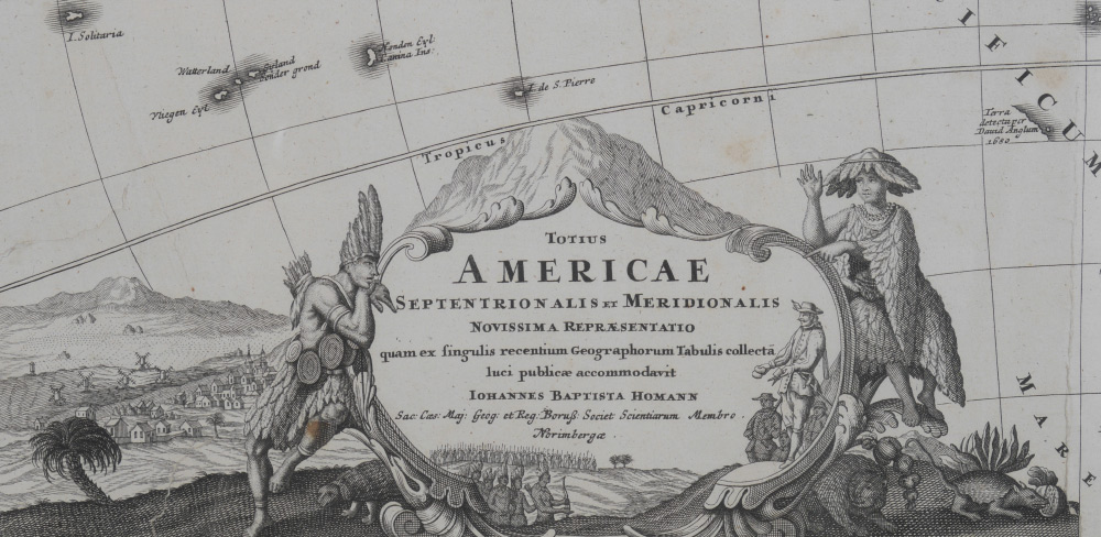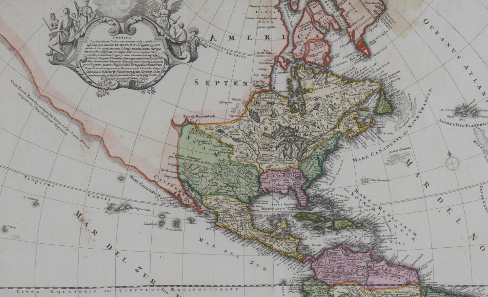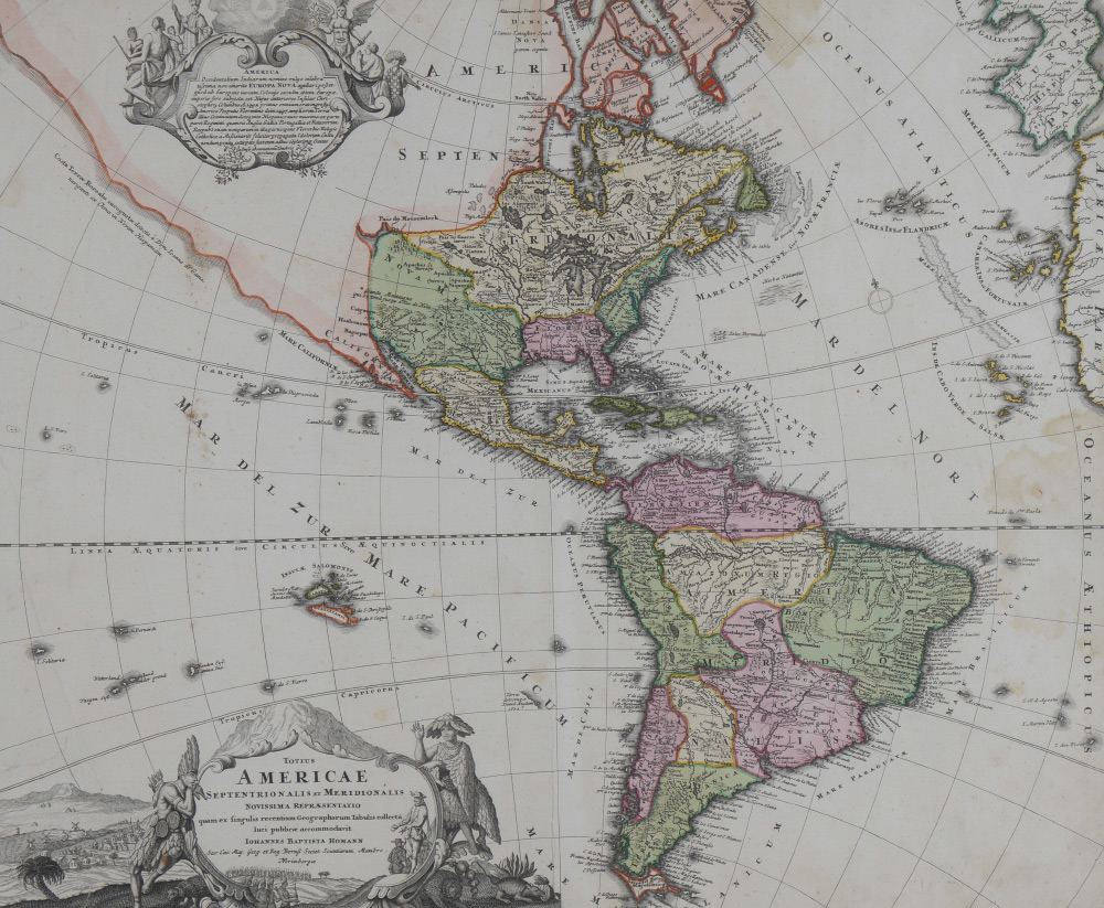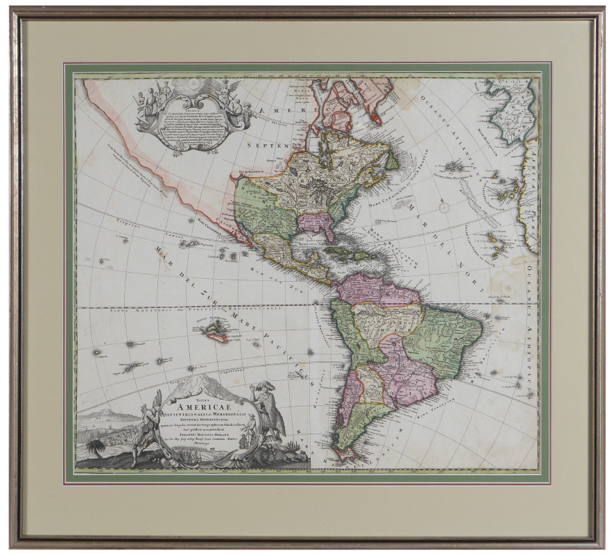 HOMANN, Johann Baptiste, (German, 1664-1724): Circa 1720, ''Totius Americae Septentrionalis et Meridionalis'', map representing North and South America with cartouches lower and upper left, traces of Africa and Europe for right. Hand colored continents, sight size 18 3/4'' x 22'', framed 25 3/4'' x 28 3/4''.