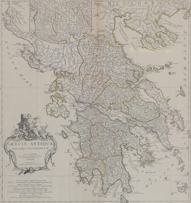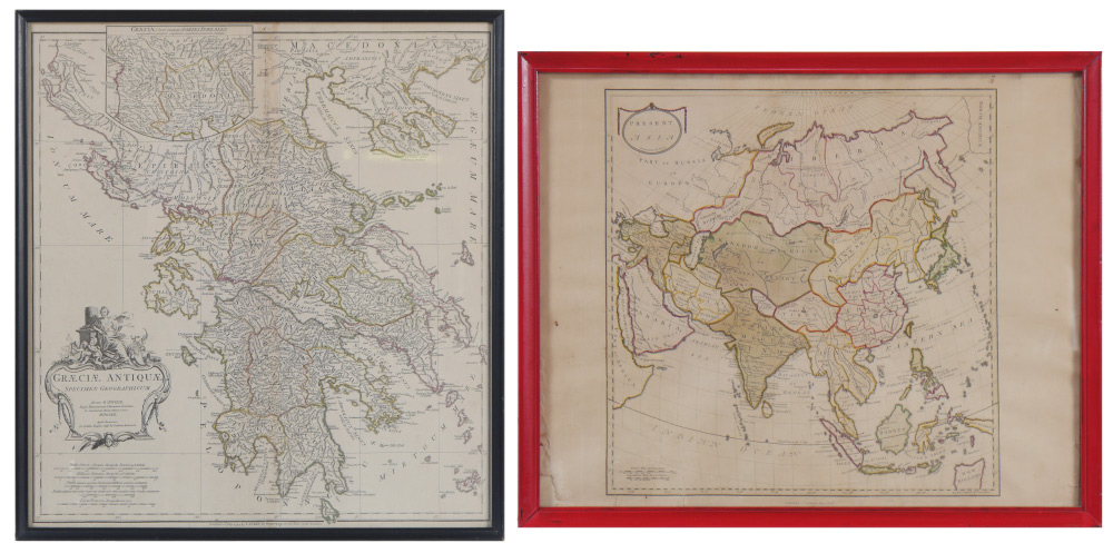 2 ANTIQUE MAPS GREECE & ASIA: 2 pieces total to include 1) D'Anville 1762 map of Greece titled ''Graeciae Antiquae Specimen Geographicum'', inset map upper left, cartouche lower left, sight size 20 3/4'' x 19 1/4'', framed 22'' x 20 1/4''. 2) S. I. Neele ''Present Asia'' published by T. Stackhouse 1783. Cartouche upper left, sight size 15 1/2'' x 19 1/2'', framed 17'' x 21''.
