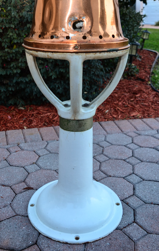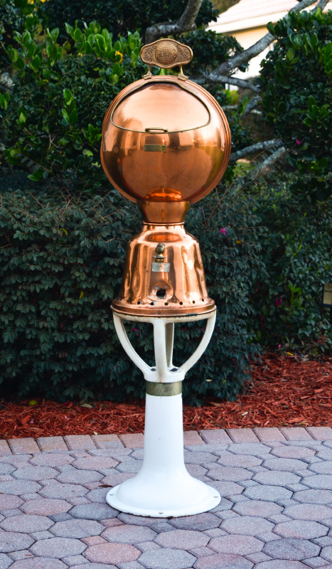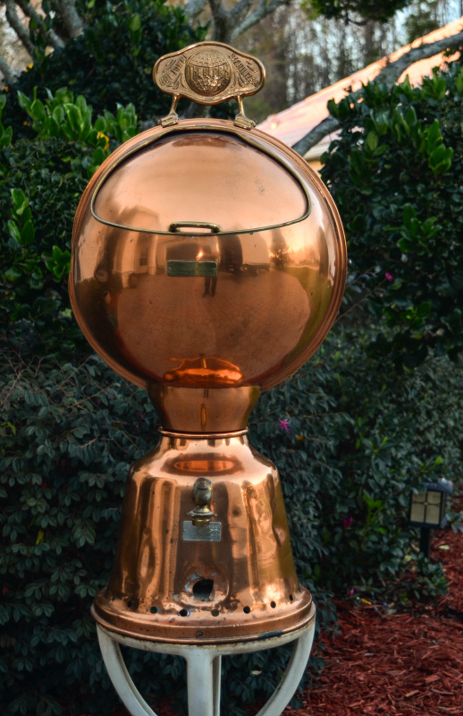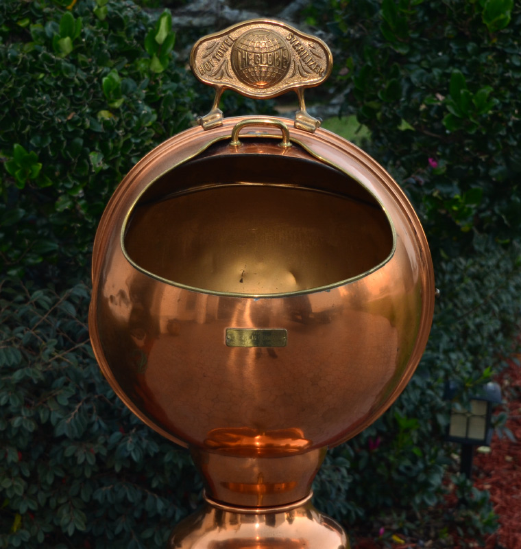 THE GLOBE HOT TOWEL STERILIZER: S. Buckman Inc., copper top with original top plaque, lift top door, partial spigot remains. Measures 32'' h. x 14 1/2'' x 15''. Sold with white porcelain cast iron base, 24 3/4'' h. x 13 3/4''.