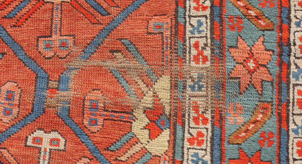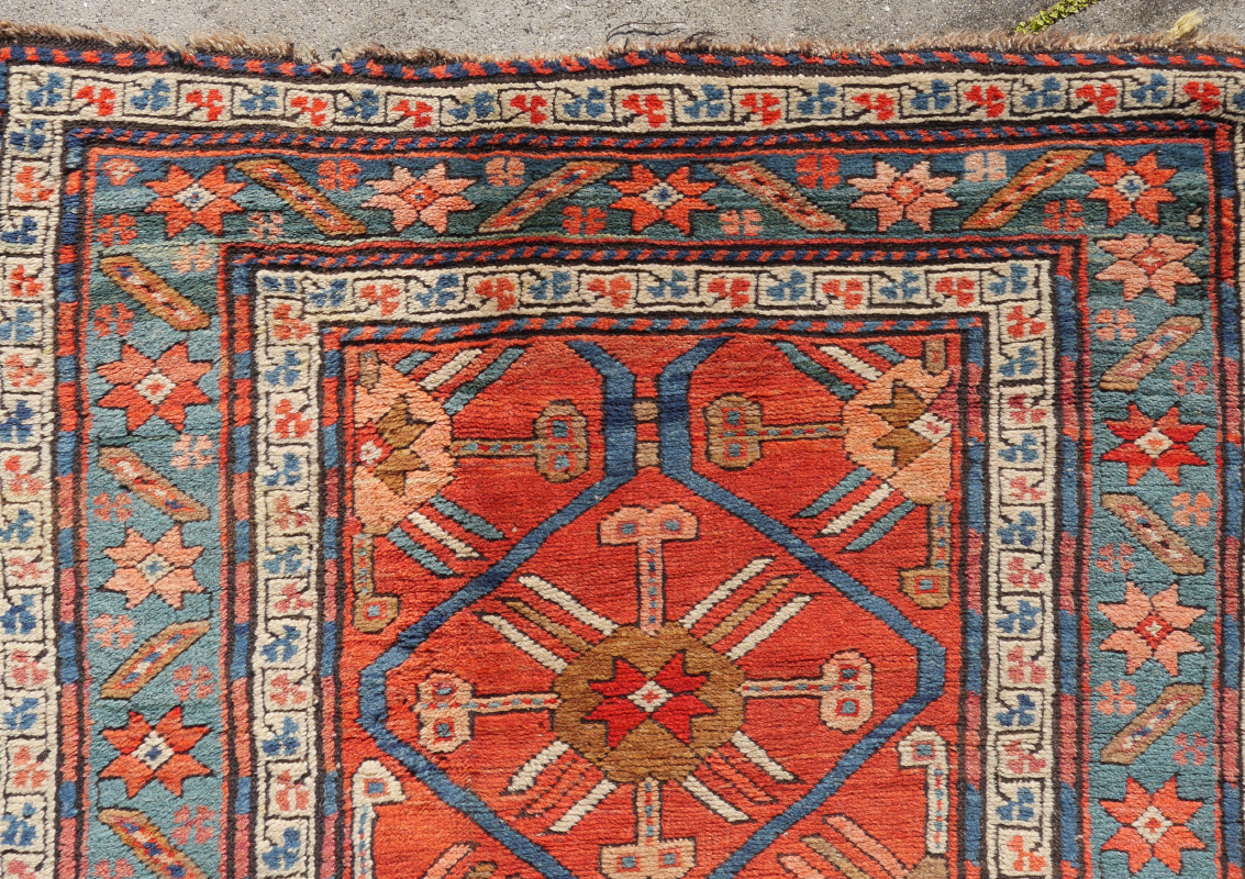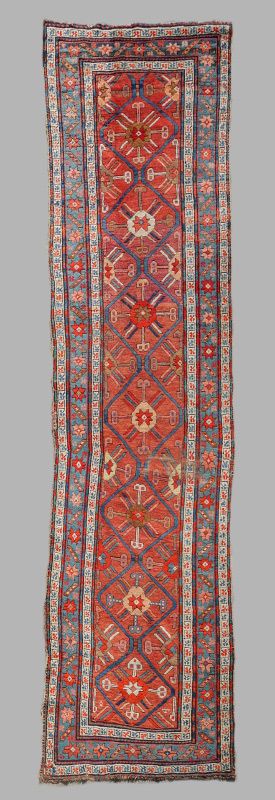 ANTIQUE CAUCASIAN KARABAGH HAND KNOTTED WOOL RUNNER, 3'4'' x 10'7'': This rug has good colors and a strong design. There are smaller medallions and half medallions on a soft brick red field that are outlined by a medium blue repeating diamond shaped band that runs the length of the rug. There are white ground guard borders and red/blue bands on either side of a pale blue ground border that has alternating stars and leaves.