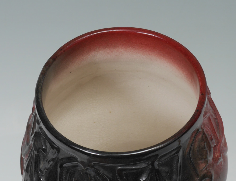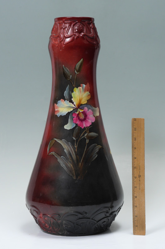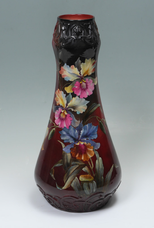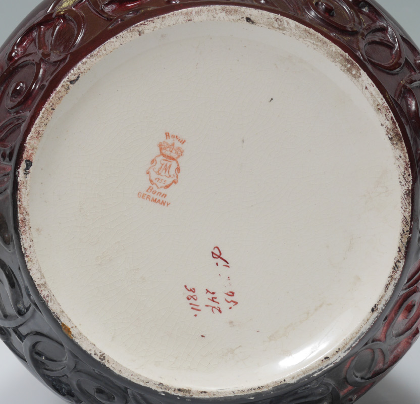 LARGE ROYAL BONN HAND PAINTED FLORAL VASE: Embossed rim and base, hand painted floral decoration. Marked on base with red Royal Bonn mark and inventory numbers. Overall measures 22 1/2'' h. x 11''.