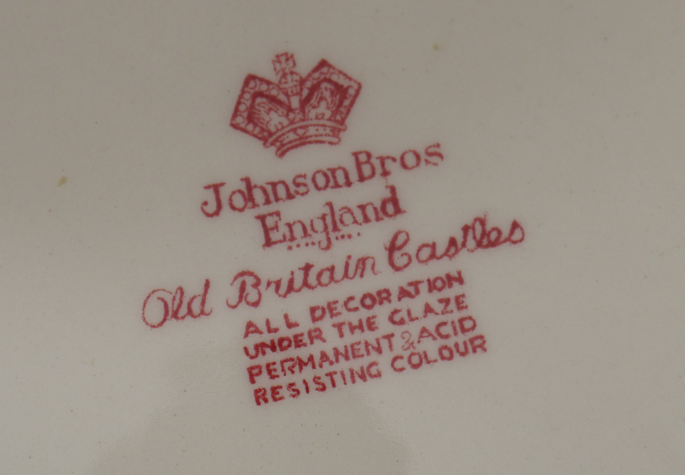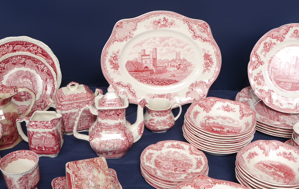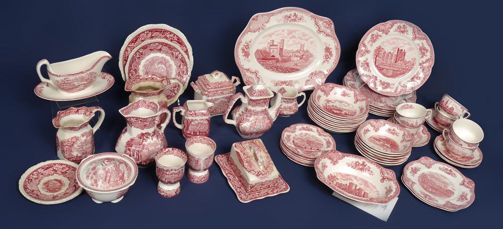 ASSEMBLED COLLECTION OF RED TRANSFER ENGLISH CHINA: To include 44 pieces Johnson Bros ''Old Britain Castles''; 14 pieces Mason's ''Vista''; 2 pieces Royal Staffordshire ''Tonquin''. Wonderful mesh of similar patterns in matching color - from cups & saucers to dinner plates to serving pieces.