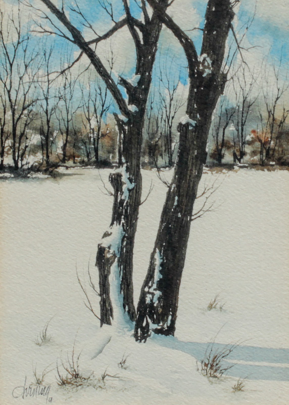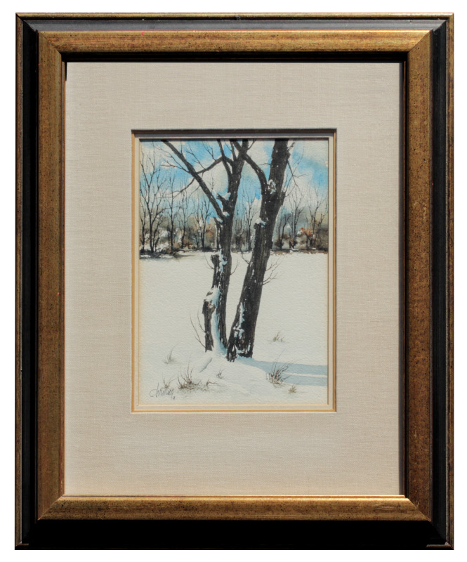 OHRNING, Rudolph, American, 20th Century): ''Trees'', depiction of trees in a snow covered landscape, Watercolor, signed and dated lower left, 8 3/4'' x 6 1/4'', matted and framed under glass. Purchased from the artist 1969.